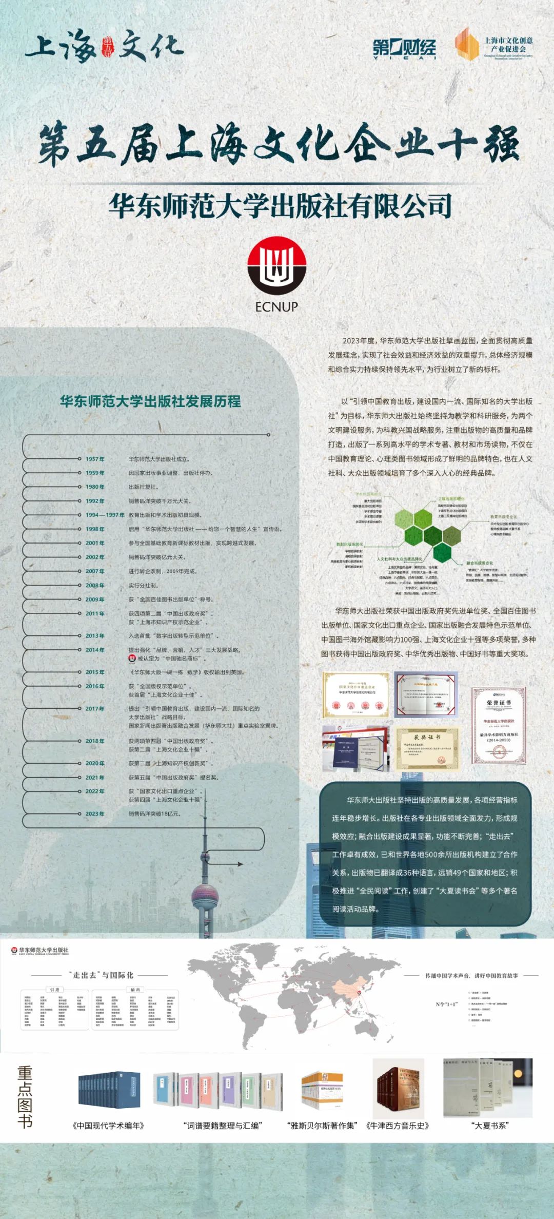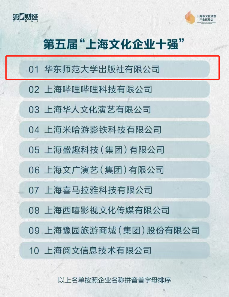 “上海文化企业十强”,着重考查企业的营业收入和税收贡献,突出企业的规模实力、对行业发展的引领、对地区经济建设的带动性以及国际文化传播的影响力。beat365英国官网网站出版社有限公司总体经济规模和综合实力持续保持领先水平,为行业树立了新的标杆。本次是第三次入选,也是唯一入选的出版企业。