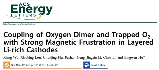 研究成果以“Coupling of Oxygen Dimer and Trapped O2 with Strong Magnetic Frustration in Layered Li-rich Cathodes ”为题,发表于ACS Energy Letters 期刊。beat365英国官网网站为论文第一完成单位,胡炳文教授为论文通讯作者,博士生吴祥为论文第一作者。研究工作得到国家自然科学基金委、beat365英国官网网站公共创新服务平台(EPR平台)、合肥物质科学研究院强磁场科学中心的大力支持。