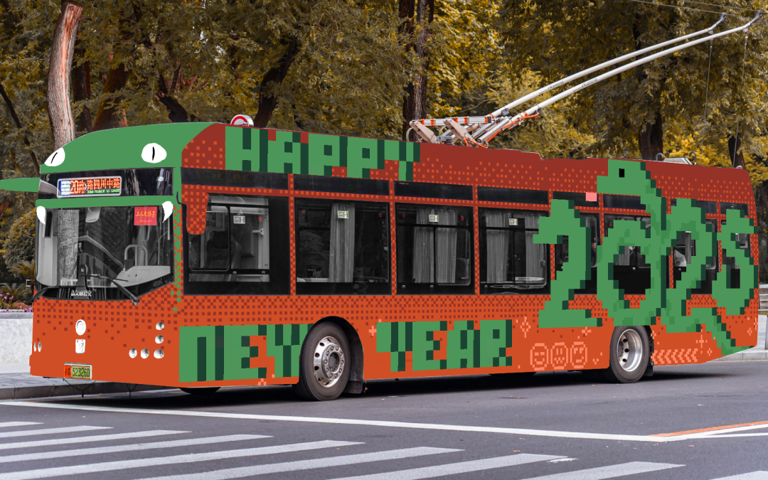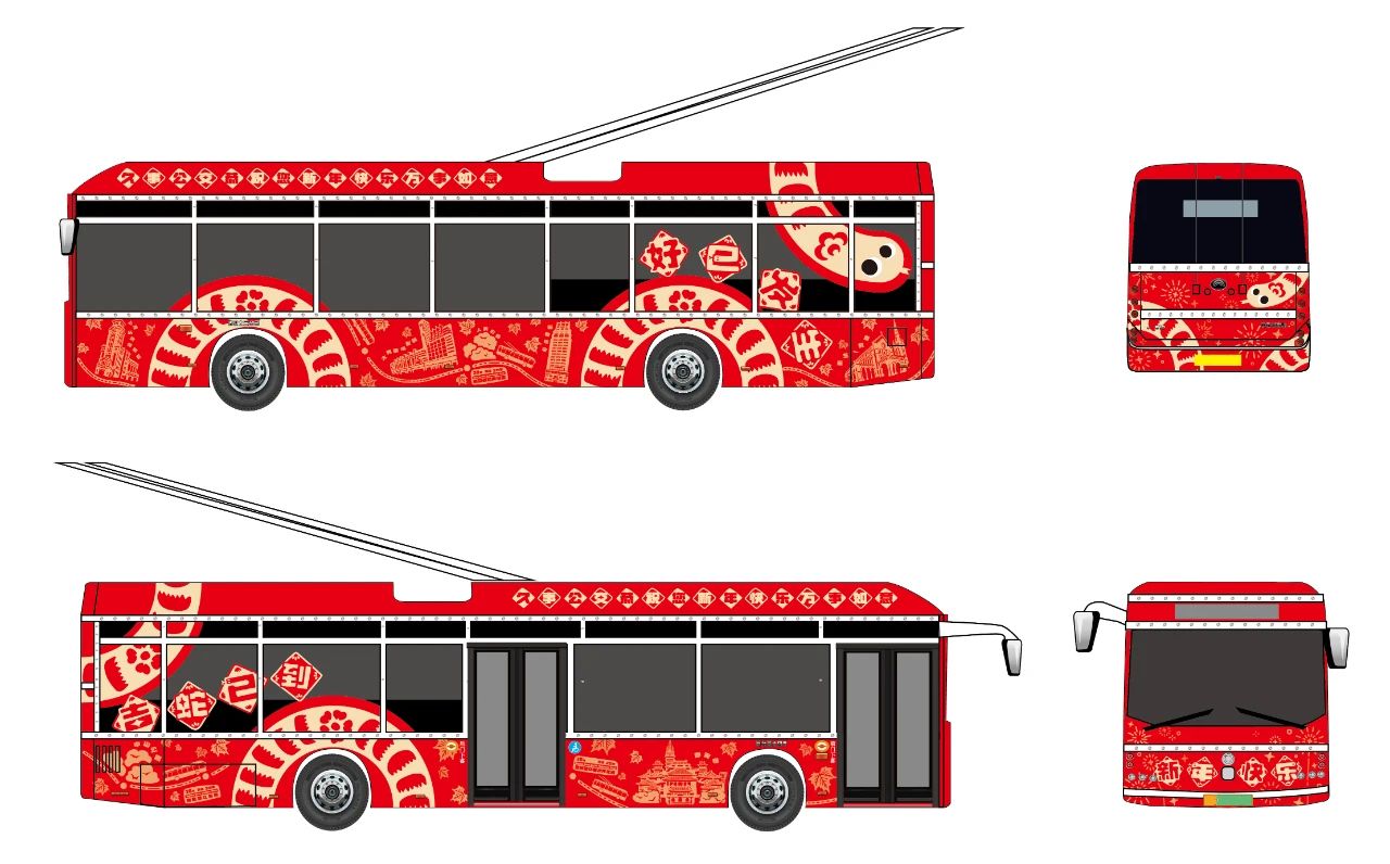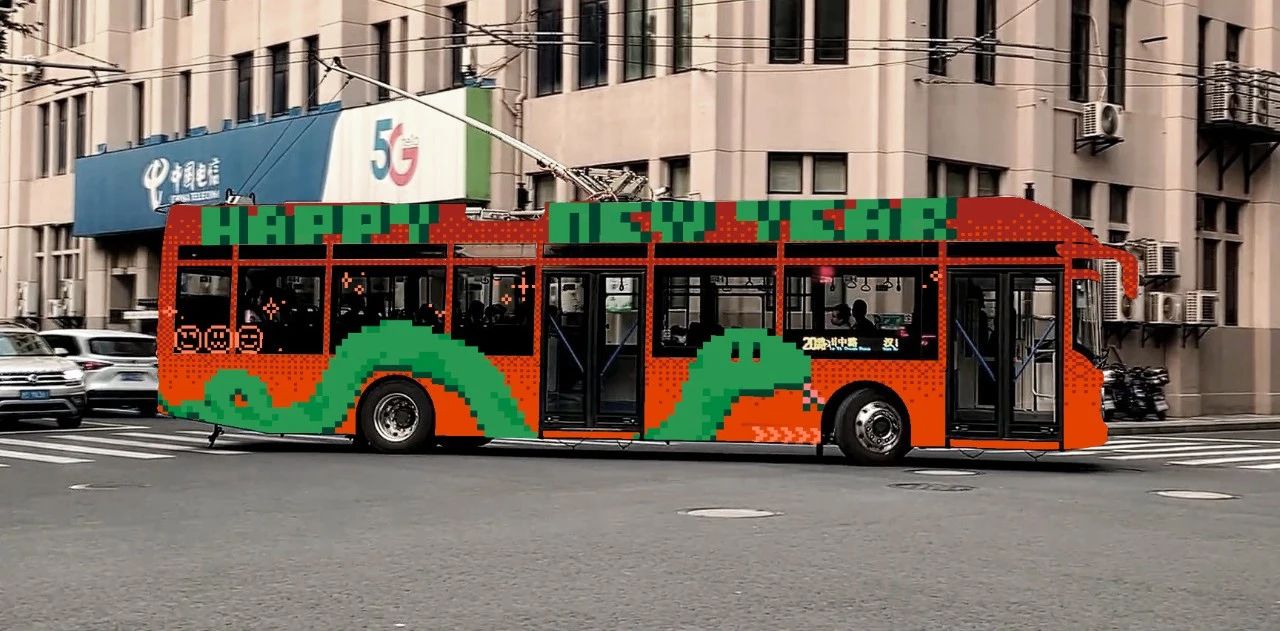 作品简述:本设计以金蛇舞动迎新春为主题,搭配经典红金色调,旨在体现春节喜庆洋洋氛围的同时,展示上海“百年公交”悠久历史的底蕴。传统色调与现代平面语言并置,融合了对美的追求和对传统的尊重,希望为市民和游客带来愉悦的视觉体验。