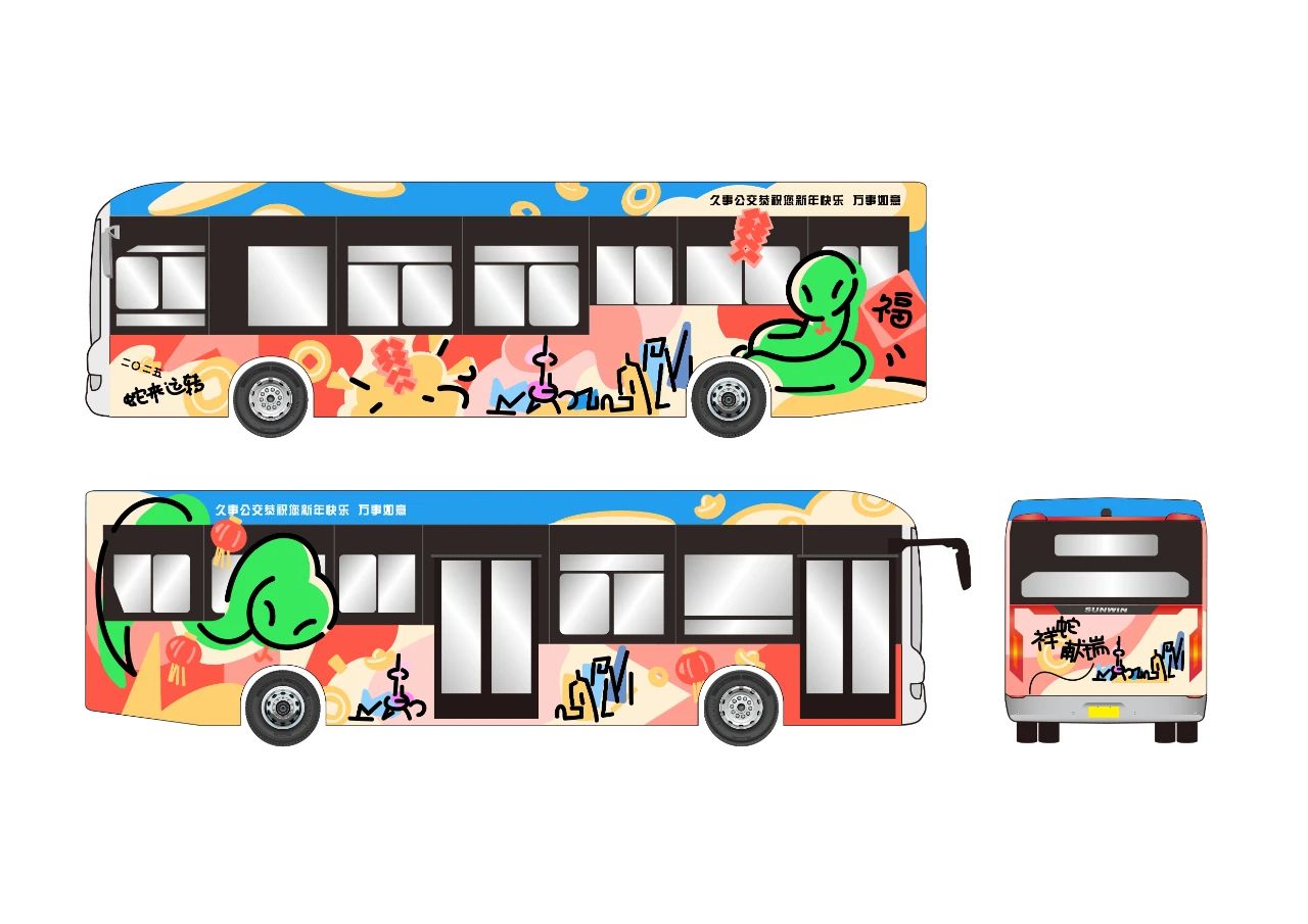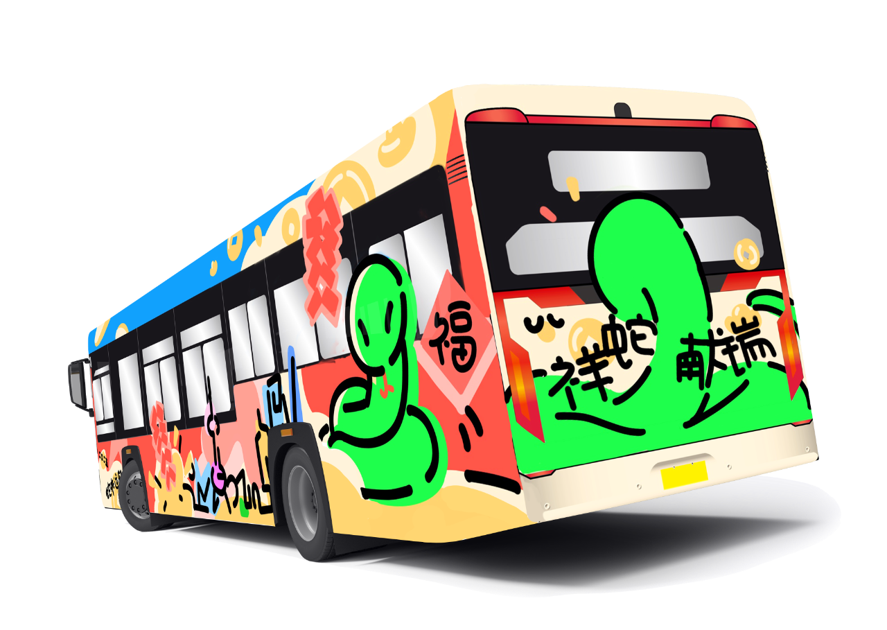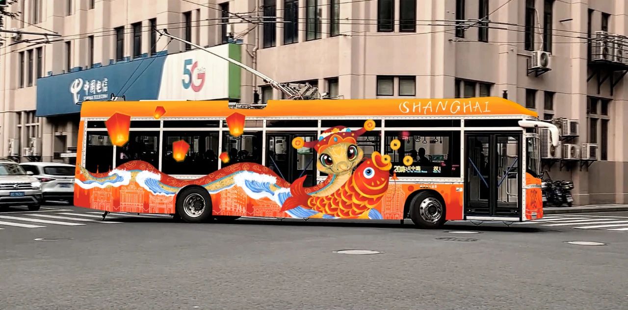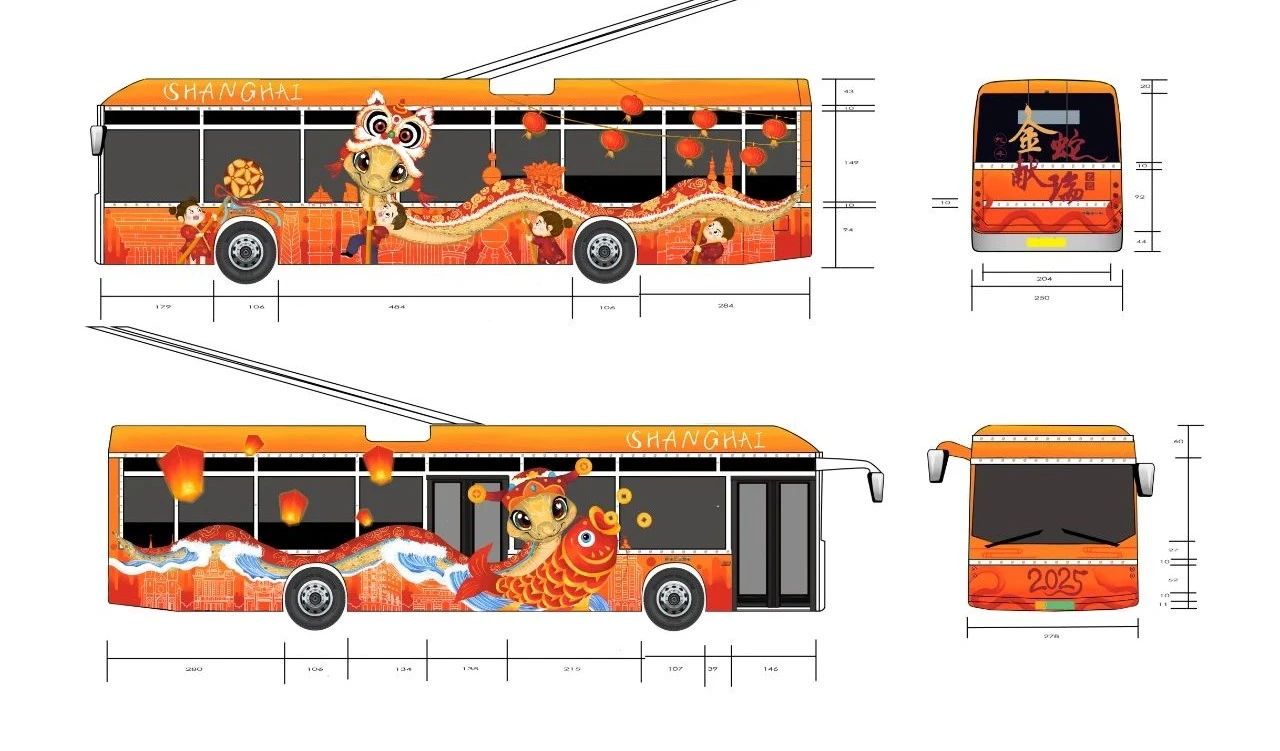 作品简述:本作品采插画风格。左面车身以财神爷形象的蛇为主角,背景辅以上海早期建筑,天灯点缀其间,营造出浓厚的传统节庆氛围。右面则转换为舞狮形象的蛇,与上海现代建筑相映成趣,灯笼高挂,彰显出都市的繁华与活力。