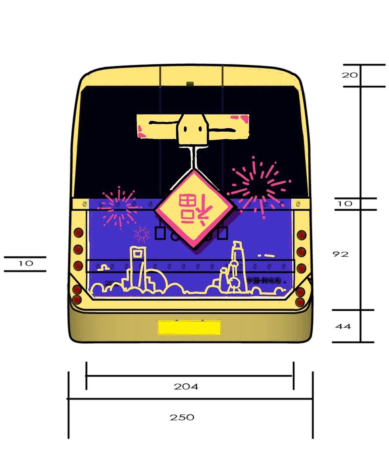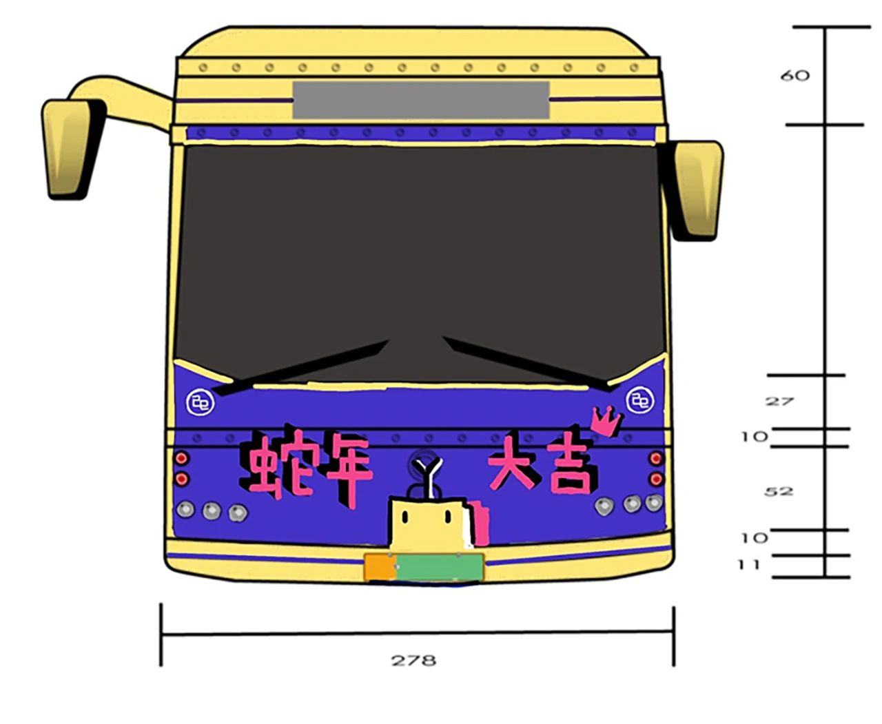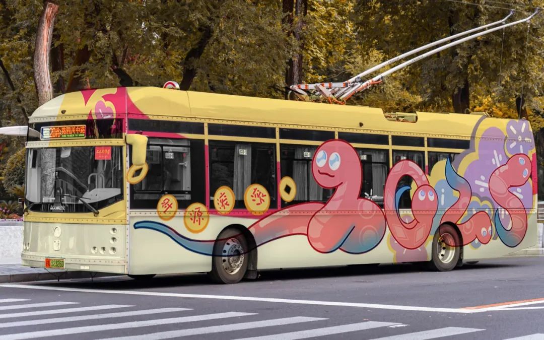 作品简述:本作品采插画风格。左面车身以财神爷形象的蛇为主角,背景辅以上海早期建筑,天灯点缀其间,营造出浓厚的传统节庆氛围。右面则转换为舞狮形象的蛇,与上海现代建筑相映成趣,灯笼高挂,彰显出都市的繁华与活力。