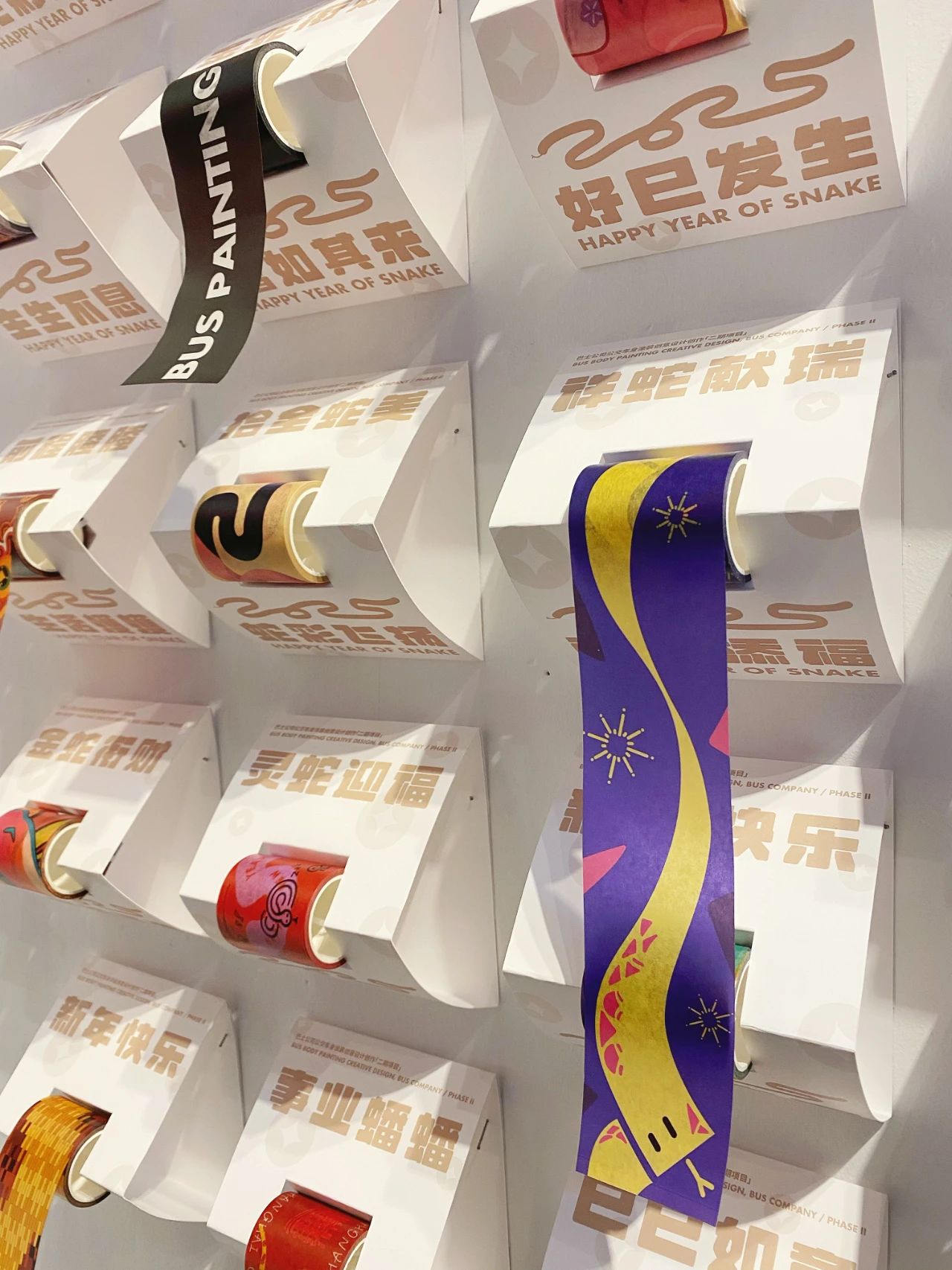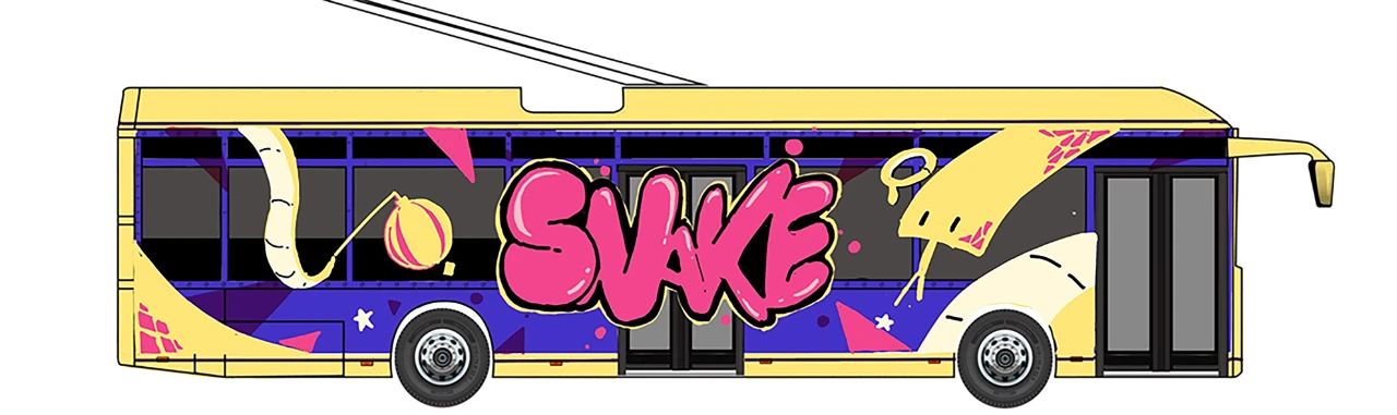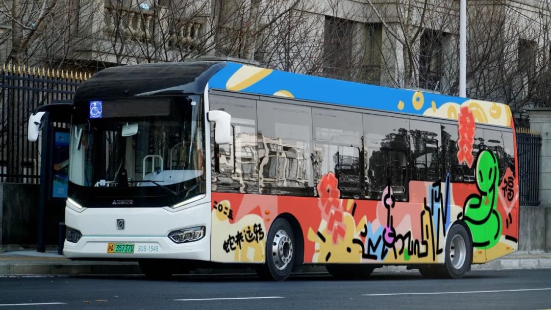作品简述:作品以黄色和紫色作为基底,借鉴和运用了街头涂鸦的表现形式,再辅以可爱的蛇形象和灯笼、烟花等传统春节元素,以求中西合璧之美。车身背面涂装中绘制了上海外滩的剪影图形,与口衔倒福字的蛇共同组成了颇具上海特色的春节画卷。