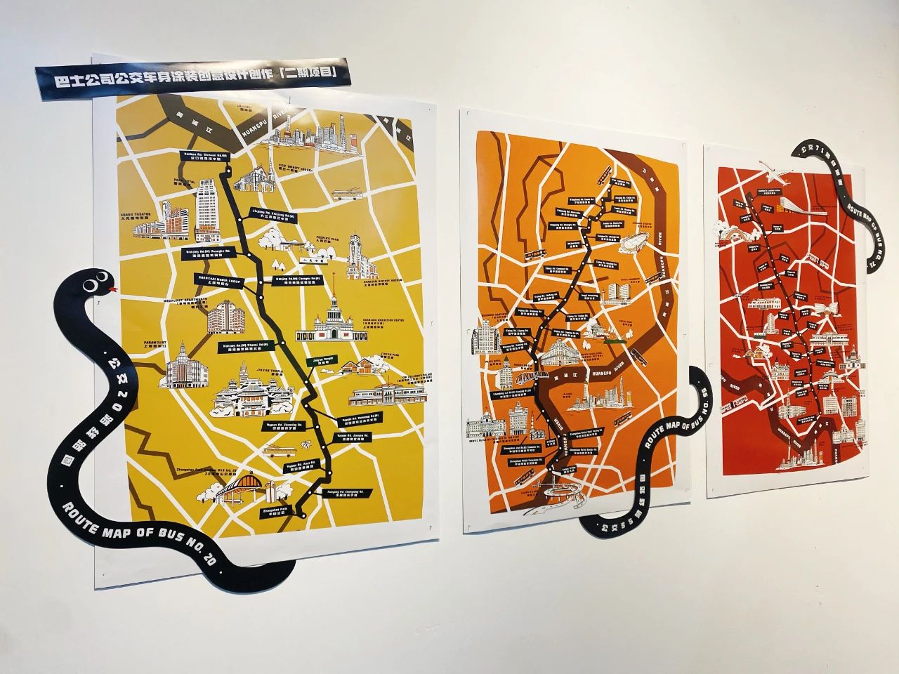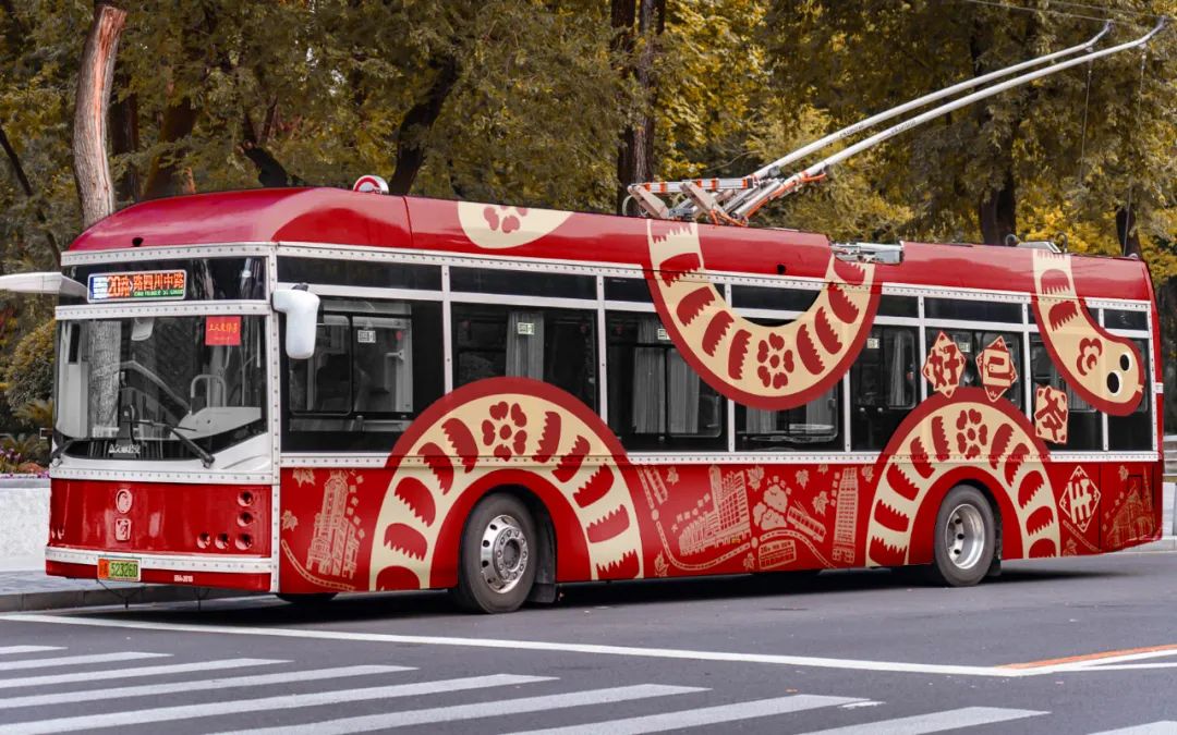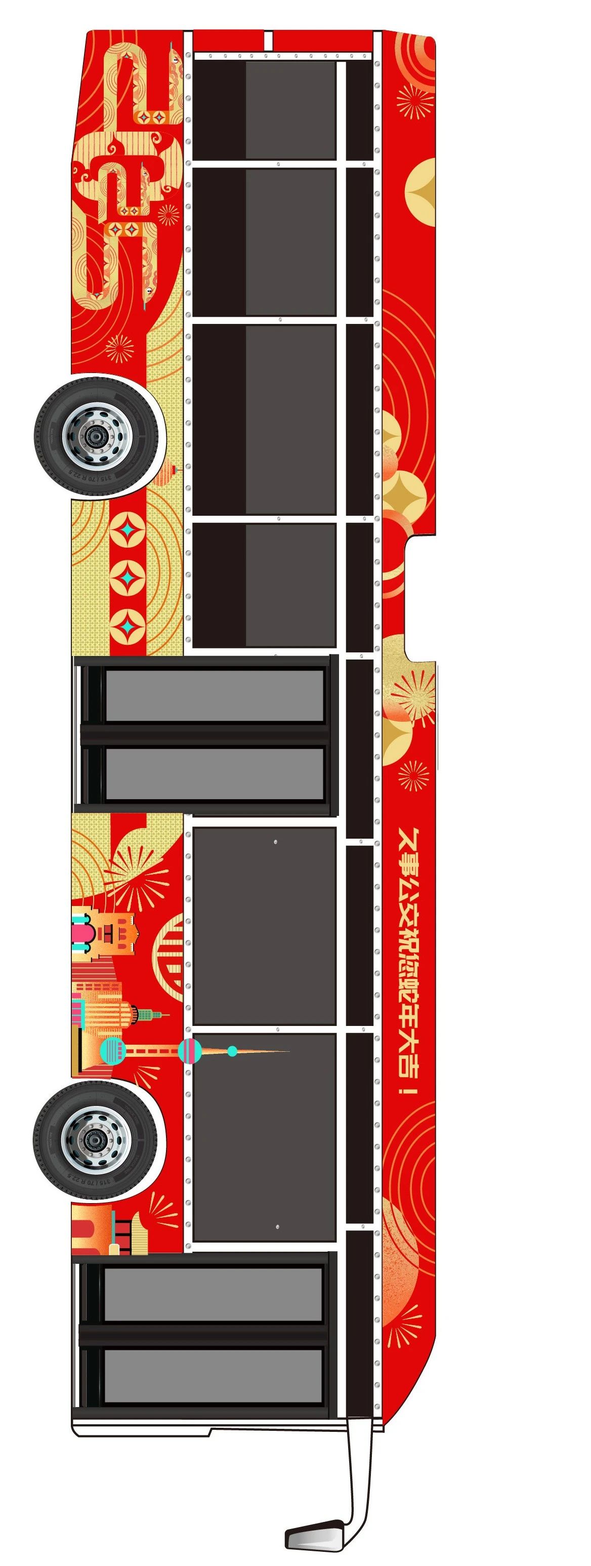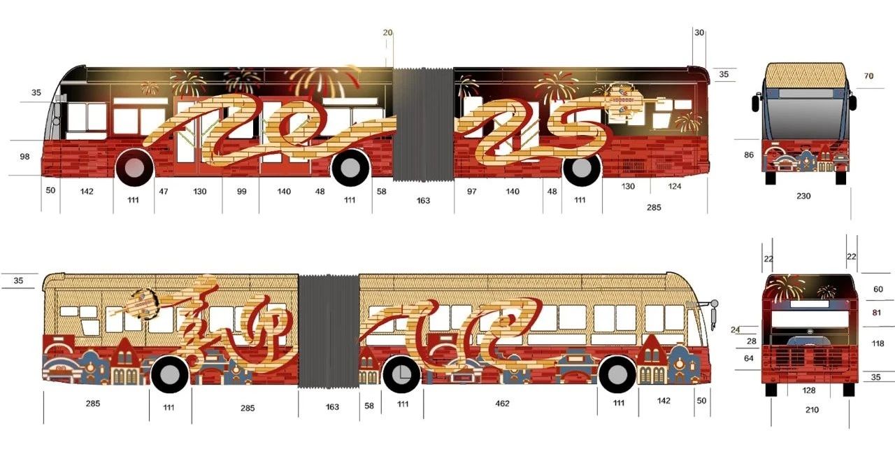 作品简述:车身以红金两色为主色调,融合海派剪纸艺术风格,金蛇缠绕车身寓意好运缠身;蛇身周围辅以20路公交沿线标志性建筑与主要站点,结合上海特色梧桐区梧桐树叶,一同展现百年公交20路的历史风采与今日辉煌。