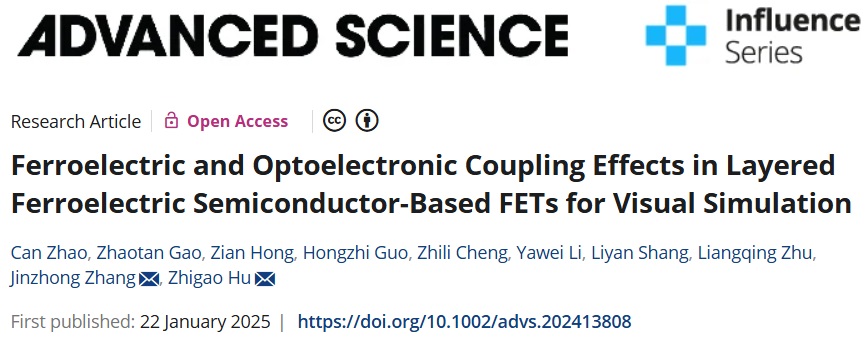 研究成果以“Ferroelectric and Optoelectronic Coupling Effects in Layered Ferroelectric Semiconductor-Based FETs for Visual Simulation ”为题,发表于Advanced Science 期刊。beat365英国官网网站为论文第一单位,胡志高教授和张金中副教授为论文通讯作者。研究工作得到国家自然科学基金委的大力支持。