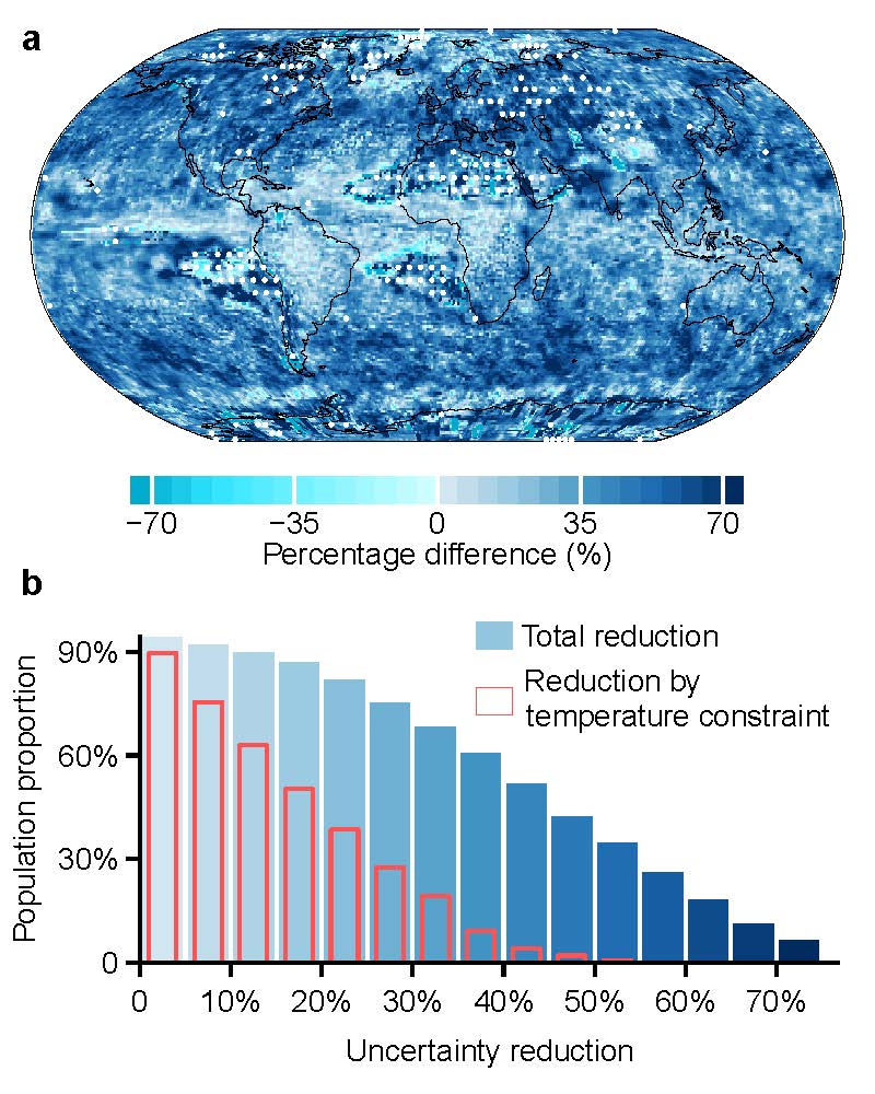 全球气候变暖加剧了极端降水强度,诱发洪涝灾害等,对自然和社会系统可持续发展带来严峻挑战。可靠预估未来极端降水变化对制定气候适应决策和防灾减灾至关重要,但局地尺度极端降水预估一直存在很大不确定性,这给科学决策带来重大挑战。beat365英国官网网站地理科学学院李超教授与国内外学者合作,提出了一种基于观测约束的预估方案,成功将全球大部分地区的局地极端降水预估不确定性降低了20%以上。这些更为可靠的预估结果可以惠及全球近90%的人口,为极端降水变化评估和适应规划提供更为精准的科学支持。研究成果近期发表在国际权威期刊 Nature Communications 上。