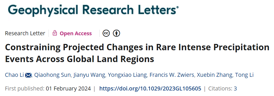 Chao Li, Qiaohong Sun, Jianyu Wang, Yongxiao Liang, Francis W. Zwiers, Xuebin Zhang, and Tong Li. (2024). Constraining projected changes in rare intense precipitation events across global land regions. Geophysical Research Letters, 51, e2023GL105605. https://doi.org/10.1029/2023GL105605