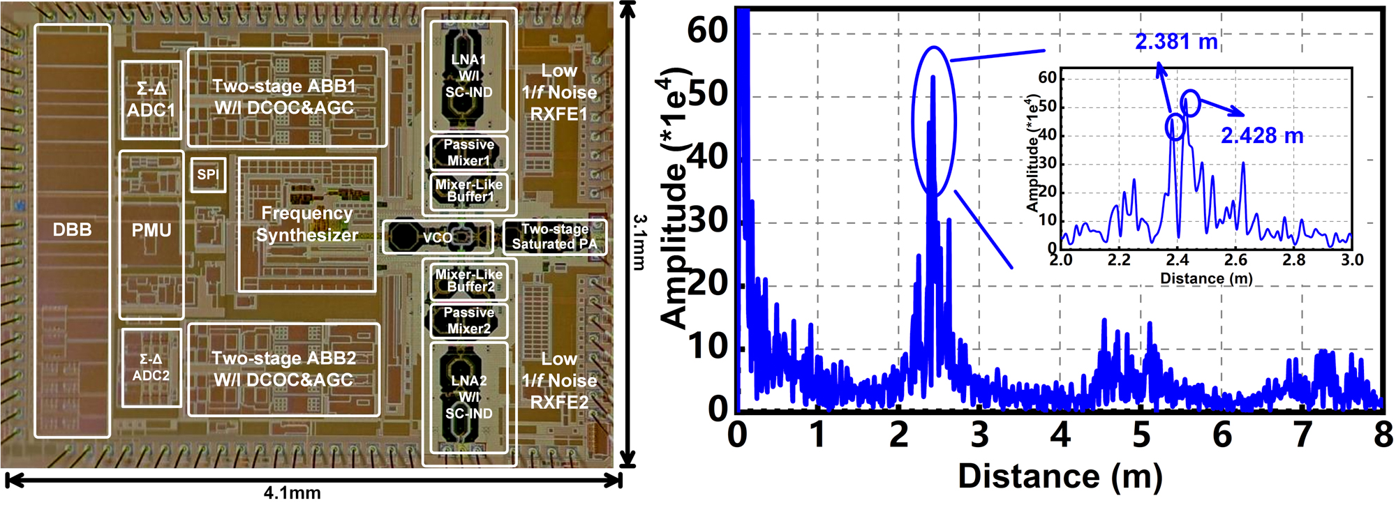论文二所设计的雷达芯片照片与室内分辨率测试结果