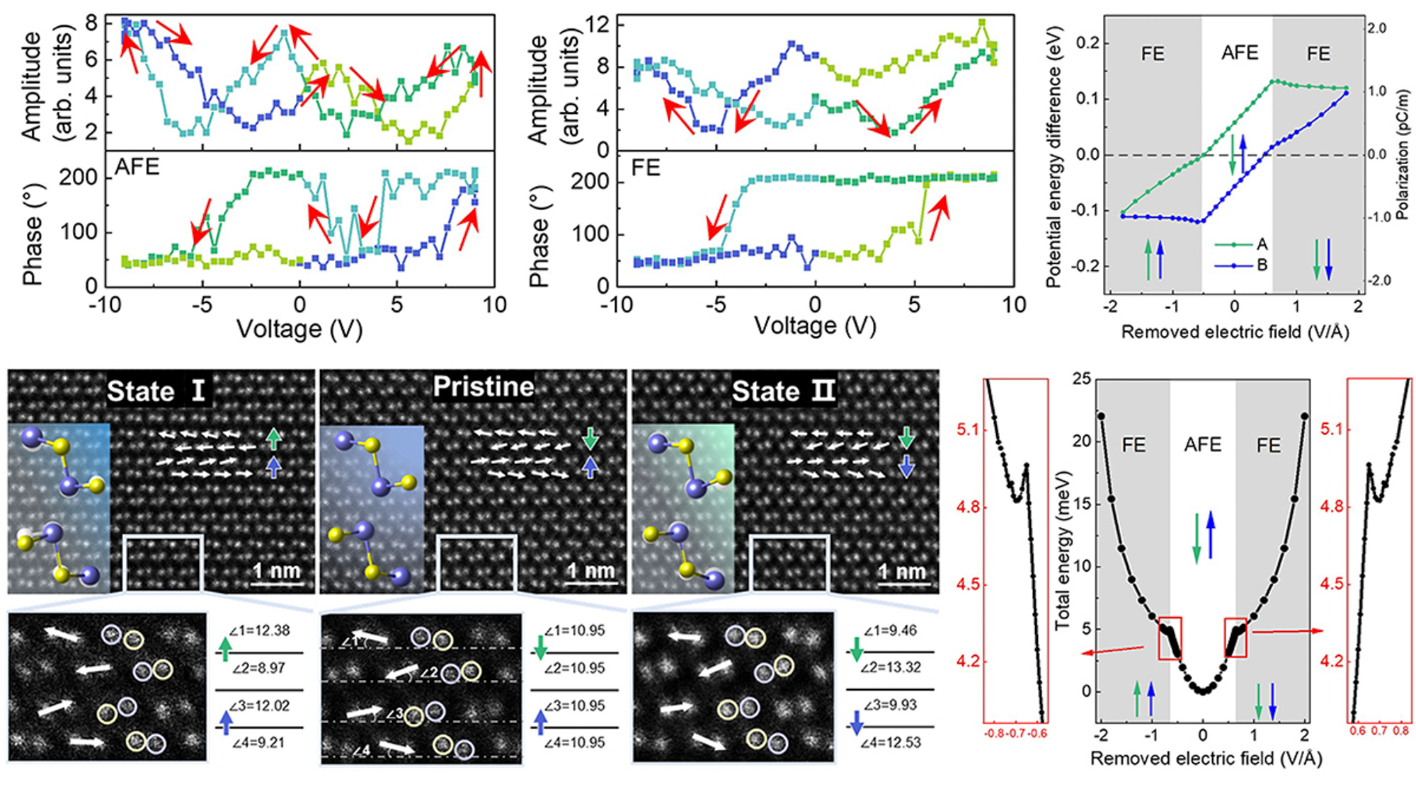 该研究首次通过第一性原理计算预测面外中心对称的GeSe半导体具有本征的面外反铁电性,并利用压电力显微镜探测到其面外反铁电性到铁电性的演化;进一步的先进原子级别原位透射电镜技术揭示了该材料体系的非常规铁电源于层内原子在面外方向的非对称位移(图2)。该研究表明二维GeSe是兼具面内和面外铁电性的二维层状半导体的新成员,大大扩展了二维铁电材料体系。