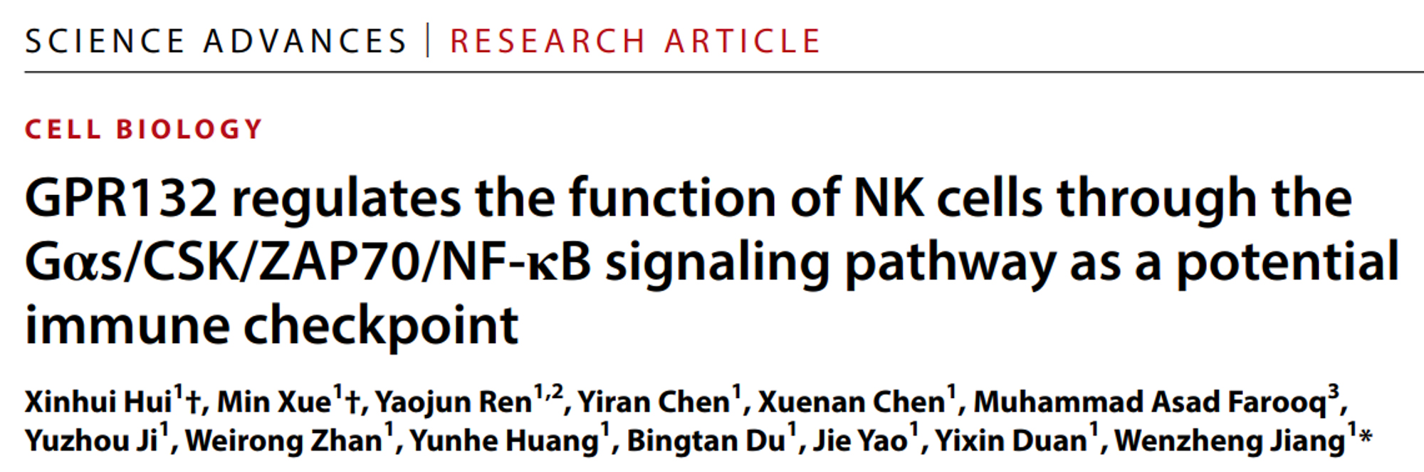 江文正教授团队近期研究揭示了GPR132对NK细胞功能的调控作用及其机制,并将其应用于CAR-NK细胞对结直肠癌的治疗中,这一发现为实体瘤的治疗提供了新的思路和策略。该研究成果于2025年3月5日以“GPR132 regulates the function of NK cells through the Gαs/CSK/ZAP70/NF-κB signaling pathway as a potential immune checkpoint ”为题在 Science Advances 上发表。
