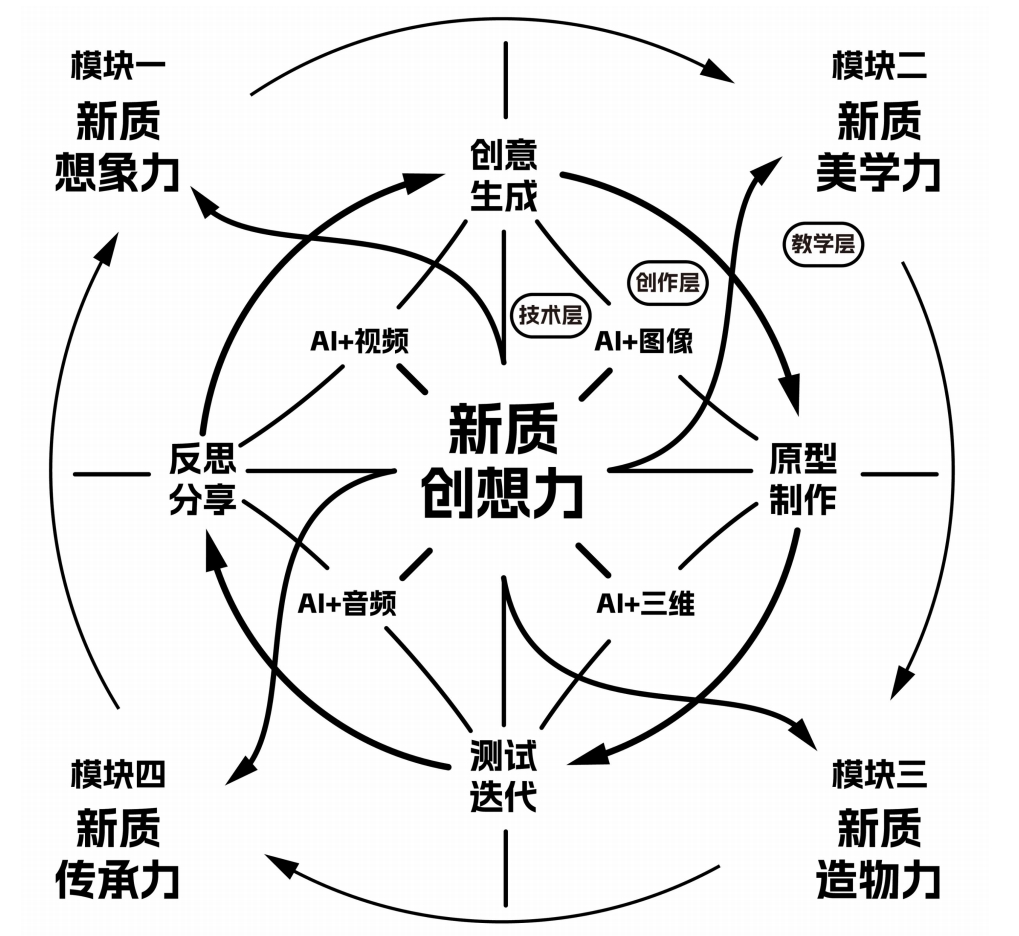 课程围绕新质想象力、新质美学力、新质造物力和新质传承力四大模块,每个模块都结合了AI技术与艺术创作的不同方面。