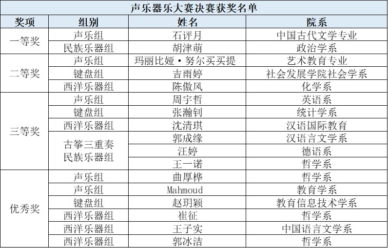 经过激烈角逐,钢琴组、声乐组、西洋乐器组与民族乐器组的选手们分别完成了精彩表演。张薇对表演进行了点评和指导,她表示通过这次比赛感受到同学们对于艺术的热爱和追求,欣赏到不同院系同学技能和精彩的表现,希望以后有机会让更多同学进行展示。