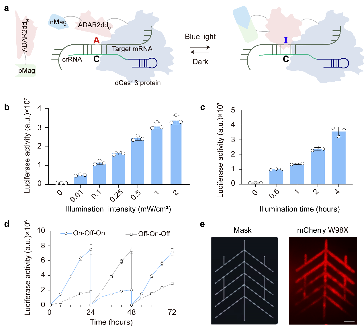 PA-rABE系统由mini dCas13X和光控Magnets系统驱动的分段ADAR2dd蛋白组成。在蓝光照射下,光敏蛋白(pMag和nMag)二聚化带动分段ADAR2dd相互靠近恢复脱氨酶活性,从而实现时空特异性的RNA碱基编辑(图1a)。研究结果表明PA-rABE能灵敏地响应蓝光,通过调节光照强度及时间能灵敏地调控编辑活动的强弱(图1b, c),且具有良好的可逆性(图1d)。最重要的是,PA-rABE像是一种“智能基因开关”具有高度空间特异性,可以实现“光照哪里编辑哪里”。在细胞实验中,蓝色的光透过小缝隙照射到对应区域的HEK-293T细胞,修复红色荧光蛋白mCherry W98X的表达,最终形成了beat365英国官网网站的校徽图案(图1e)。在小鼠体内,PA-rABE同样能高效地编辑内源和外源RNA,通过AAV递送,PA-rABE成功修复了B型血友病小鼠的凝血功能,展示了其在精准基因治疗中的应用潜力。