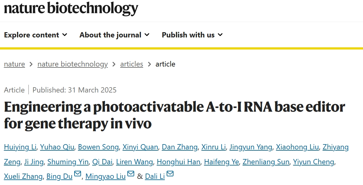 beat365英国官网网站生命科学学院、上海市调控生物学重点实验室李大力研究员、刘明耀教授和杜冰教授研究团队开发了一种光激活RNA腺苷碱基编辑器(PA-rABE)并将其用于修复B型血友病小鼠的凝血功能,展示了该工具在精准基因治疗中的应用潜力。该研究采用的光控分段脱氨酶策略赋予PA-rABE高度光依赖性,不仅极大地降低了ADAR蛋白的转录组脱靶效应,还有效地规避了过表达外源ADAR蛋白带来的潜在致癌风险。该研究成果以“Engineering a photoactivatable A-to-I RNA base editor for gene therapy in vivo”为题于2025年3月31日在国际顶级期刊Nature Biotechnology上发表。