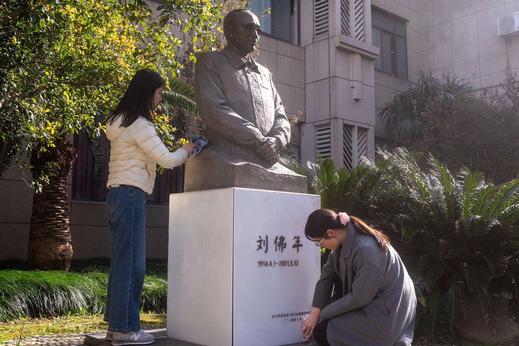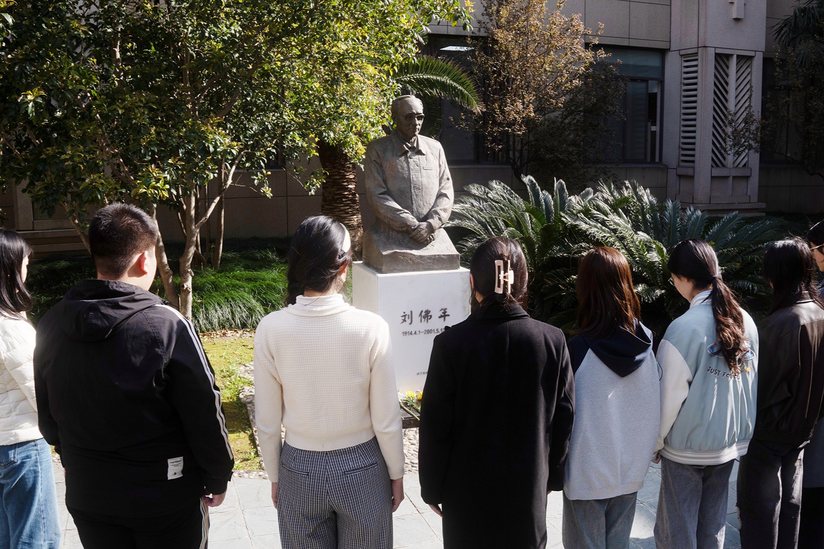 立三尺讲台,谋百年树人。在刘佛年老校长的铜像前,师生代表手持素帕擦拭铜像,大家敬献鲜花,垂首静默,在春风中寄托对教育先贤的追思。