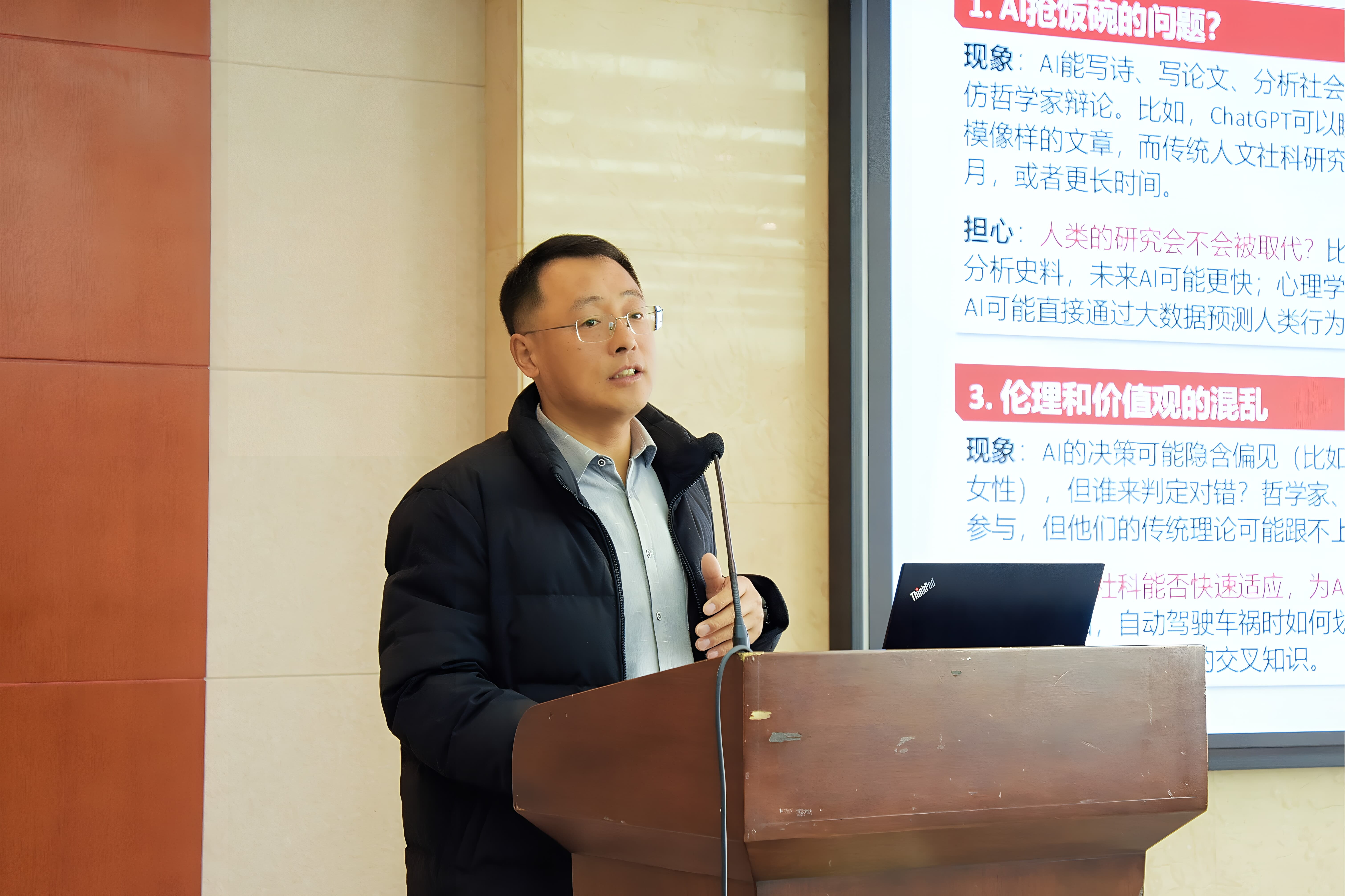 上海交通大学文科处副处长、智慧人文社科中心常务副主任罗金才受邀作题为“智慧文科建设的思考与举措”的专题报告。罗金才从人工智能时代带来的挑战、分析与思考、探索与实践三个方面系统阐述了上海交大在智慧文科领域的战略布局和具体实践,并以“武康大楼百年历史沉浸展项目”为例介绍了学校在多学科交叉、有组织科研、通过成果转化服务经济发展的典型举措。他表示,面对AI技术的快速发展,文科领域需要主动拥抱变化,通过人工智能( AI )与人类智慧( HI )充分融合,将为文科领域教学、科研和人才培养开辟前所未有的广阔天地;文科领域也将率先示范,引领AI应用,打造AI&HI融合生态系统。