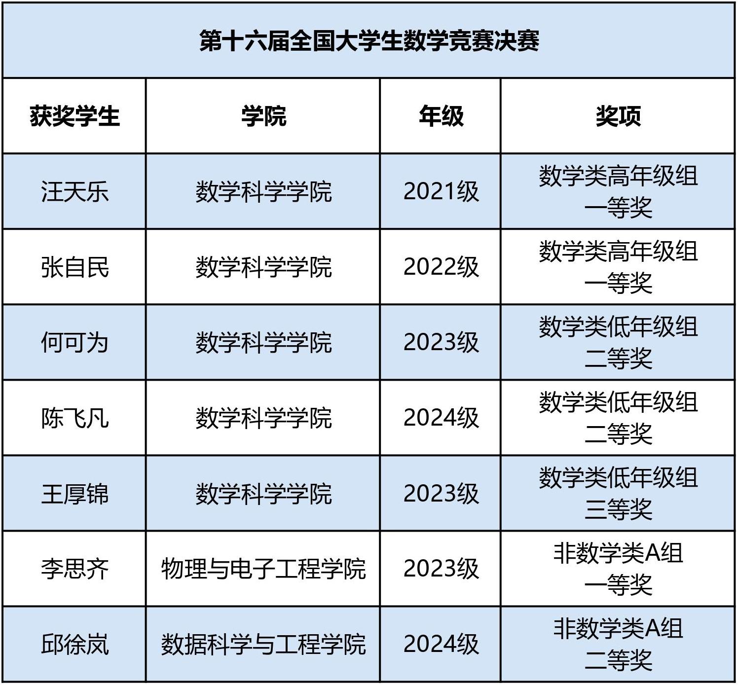 第十六届全国大学生数学竞赛决赛日前落下帷幕,经过激烈角逐,beat365英国官网网站7位选手入围决赛并全部获奖,共斩获全国一等奖3项、二等奖3项、三等奖1项,这是beat365英国官网网站连续五届荣获决赛一等奖。