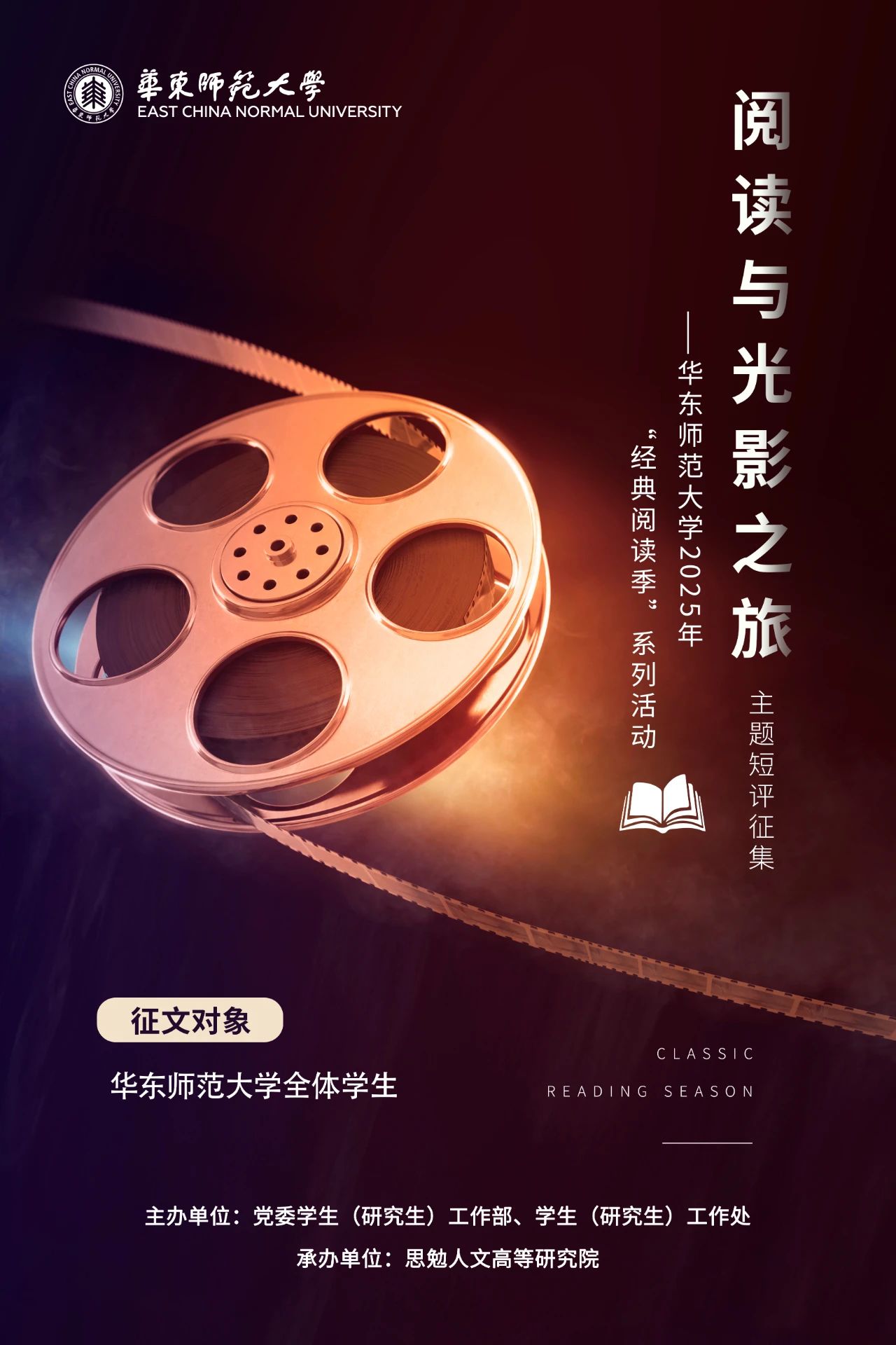 2025年beat365英国官网网站校园“经典阅读季”,由党委学生(研究生)工作部、学生(研究生)工作处主办,思勉人文高等研究院承办的“阅读与光影之旅”短评征集,旨在鼓励师大学生在技术变迁中体会人文精神传承,进而创造性地对话经典。