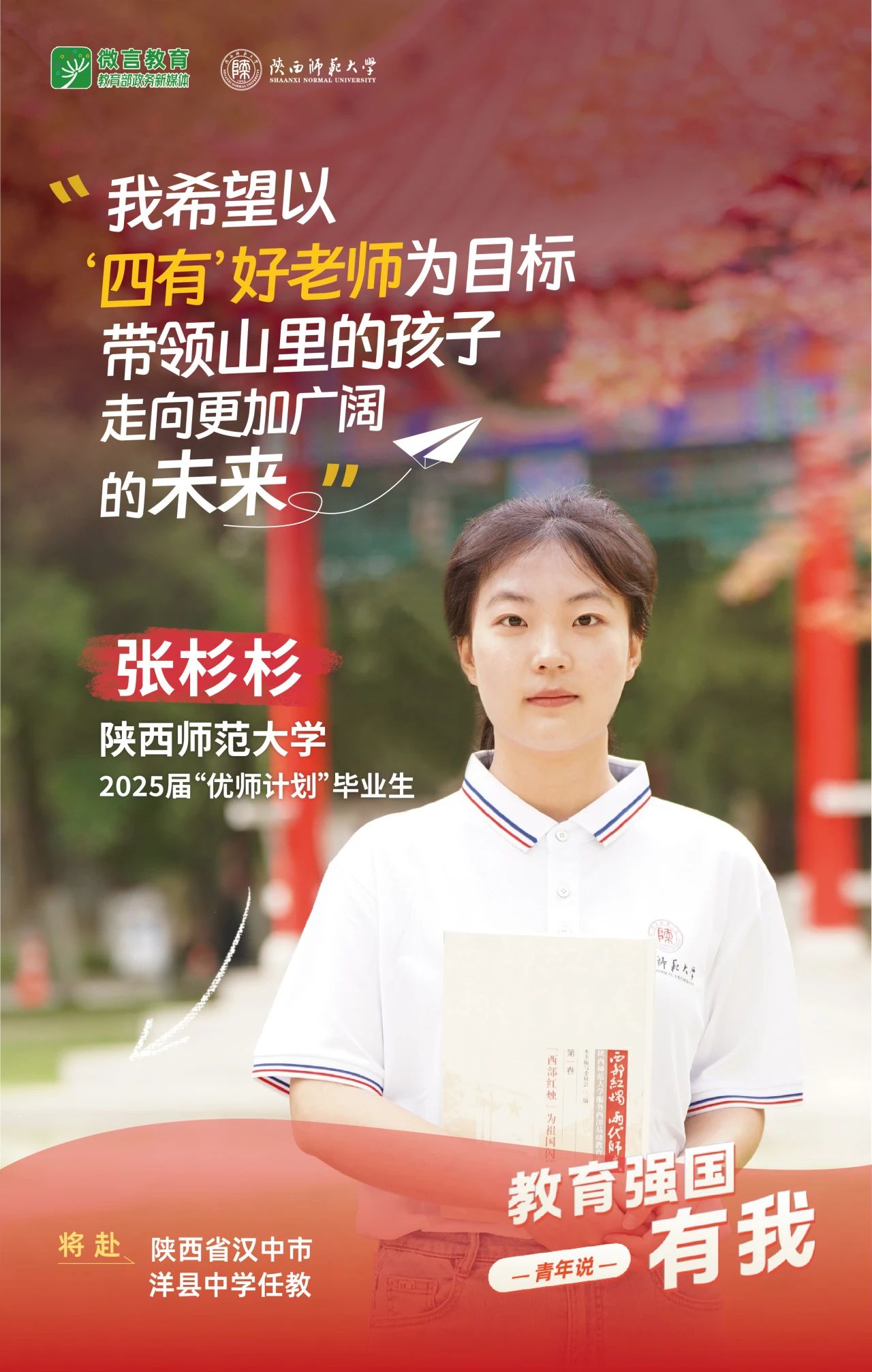 我是陕西师范大学2025届“优师计划”毕业生张杉杉,我将赴陕西省汉中市洋县中学任教。我希望以“四有”好老师为目标,带领山里的孩子走向更加广阔的未来。