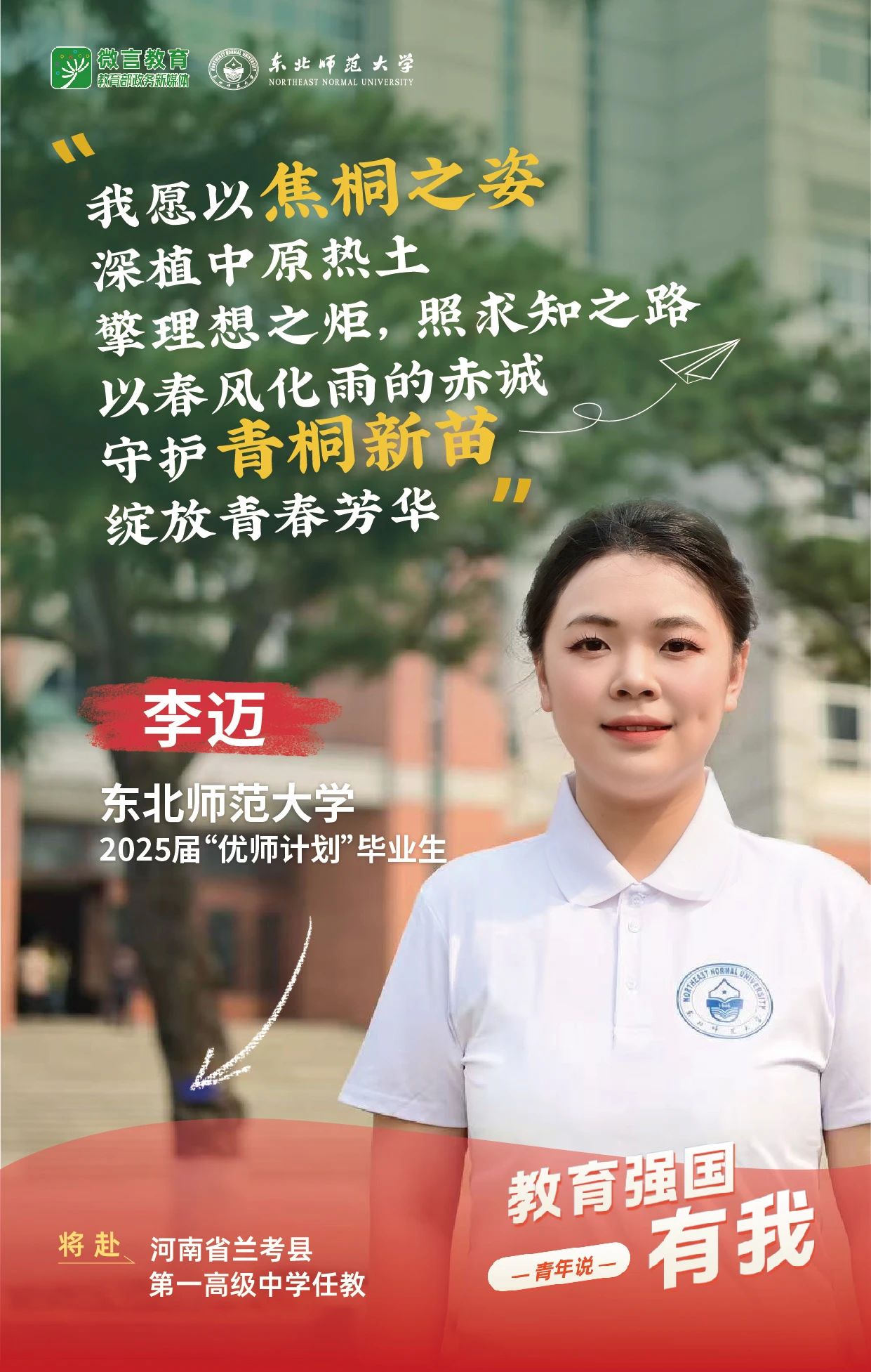 我是东北师范大学2025届“优师计划”毕业生李迈,我将赴河南省兰考县第一高级中学任教。我愿以焦桐之姿,深植中原热土擎理想之炬,照求知之路;以春风化雨的赤诚守护青桐新苗,绽放青春芳华。