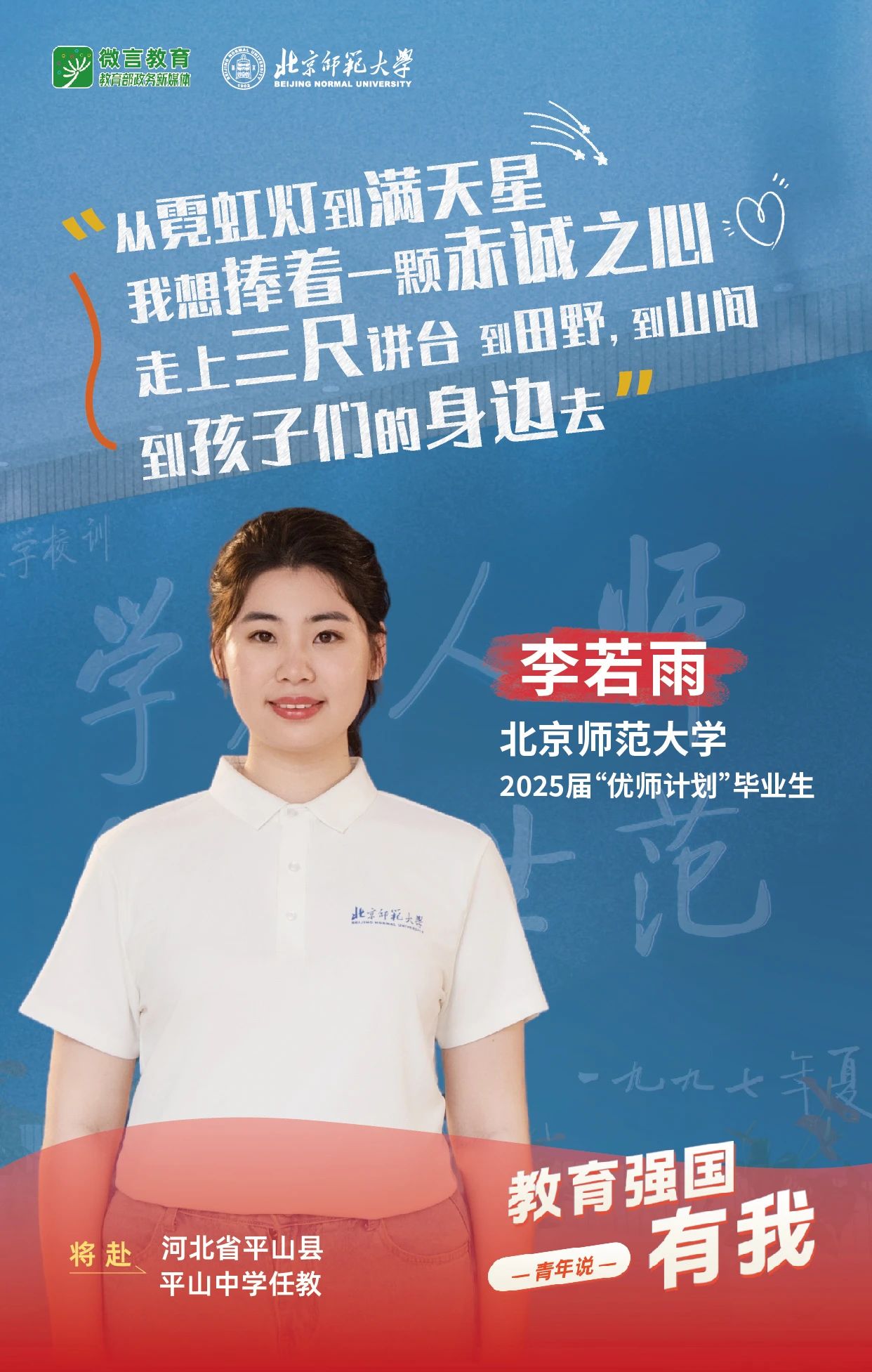 我是北京师范大学2025届“优师计划”毕业生李若雨,我将赴河北省平山县平山中学任教。从霓虹灯到满天星,我想捧着一颗赤诚之心走上三尺讲台,到田野,到山间,到孩子们的身边去。
