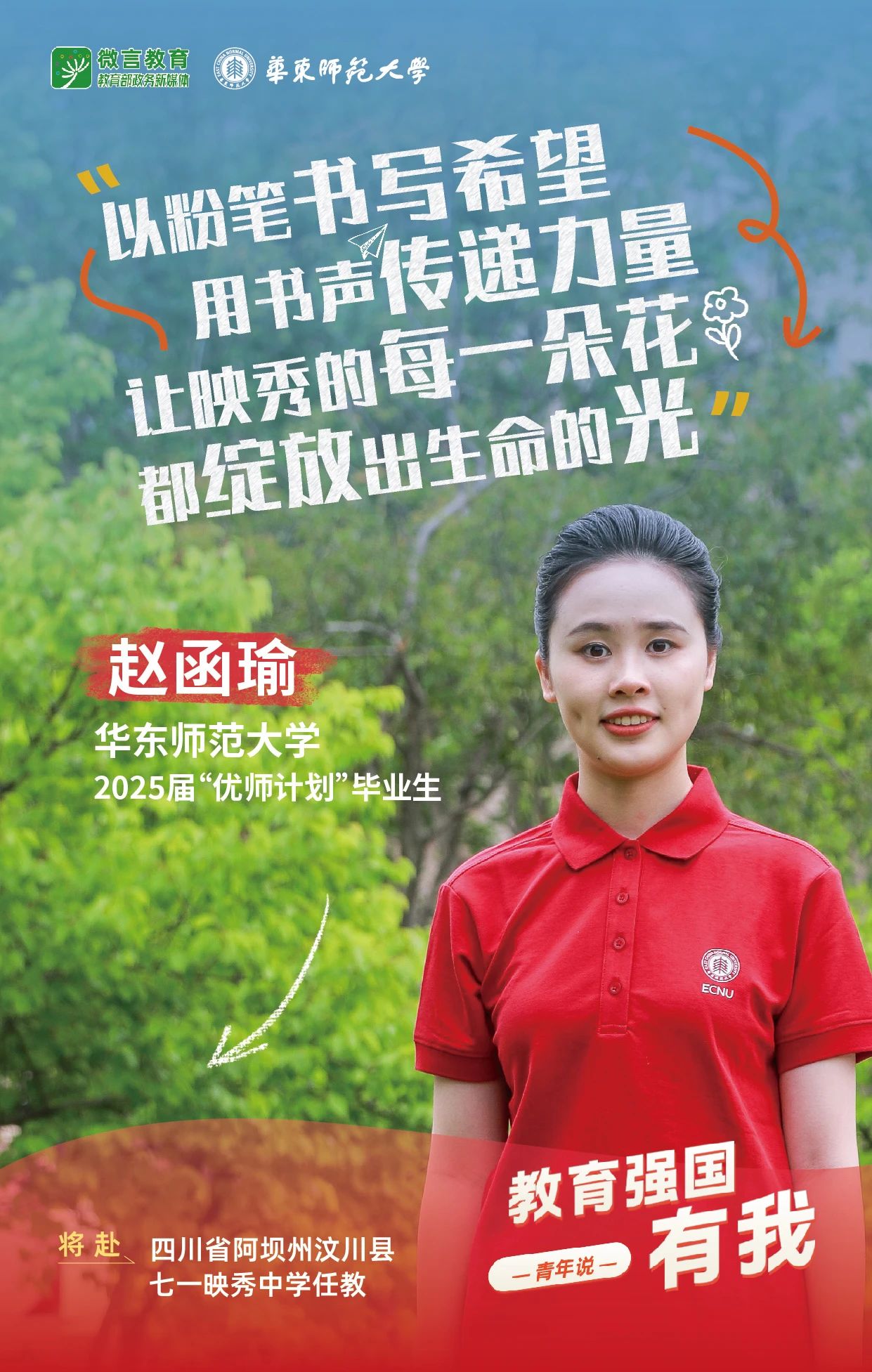 我是beat365英国官网网站2025届“优师计划”毕业生赵函瑜,我将赴四川省阿坝州汶川县七一映秀中学任教。以粉笔书写希望,用书声传递力量,让映秀的每一朵花都绽放出生命的光。