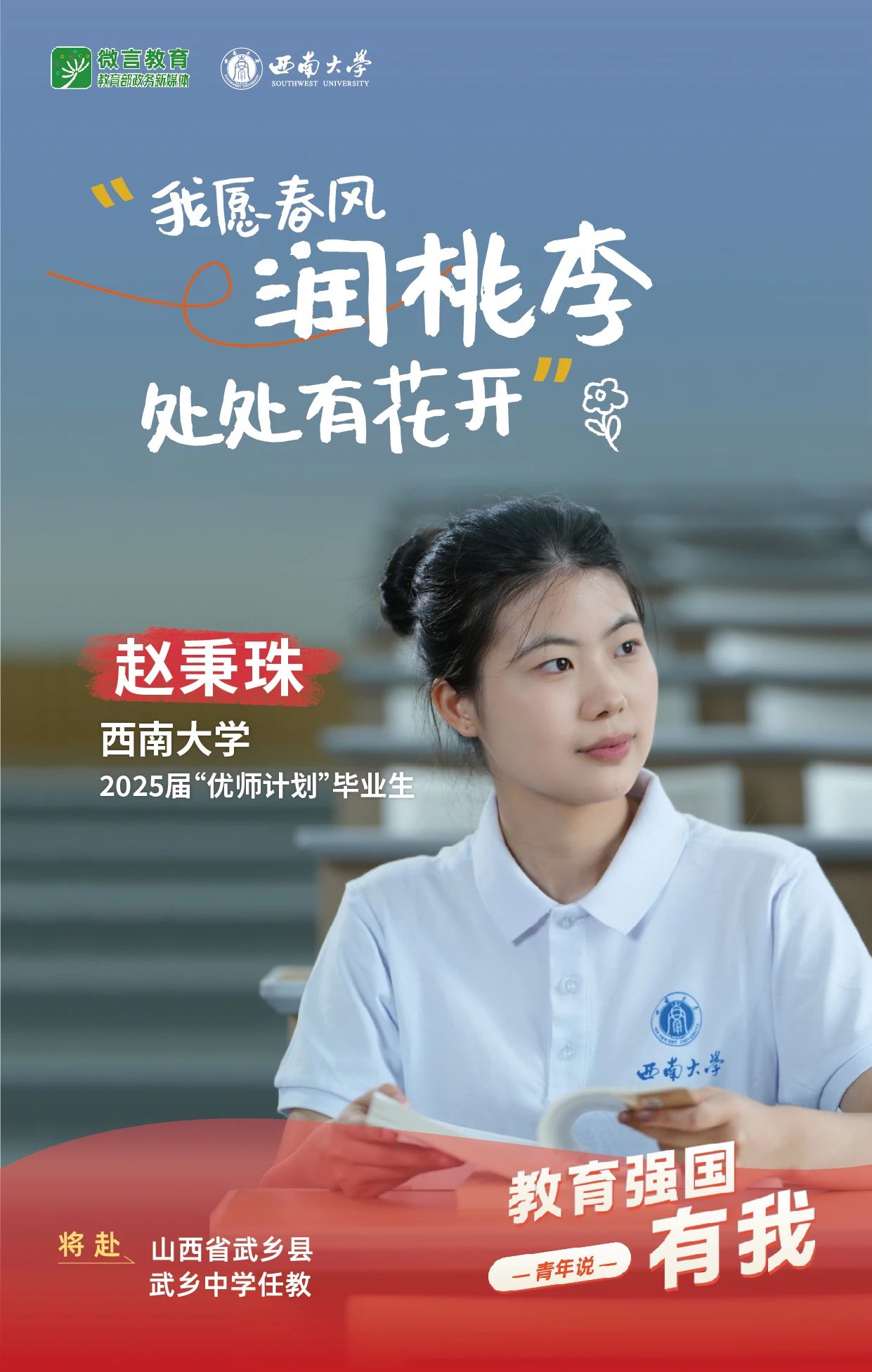 我是西南大学2025届“优师计划”毕业生赵秉珠,我将赴山西省武乡县武乡中学任教。我愿春风润桃李,处处有花开。
