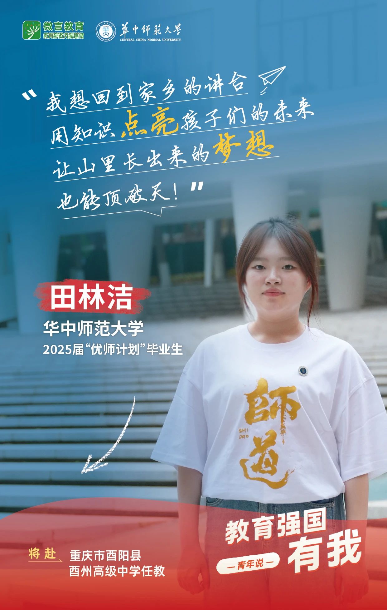 我是华中师范大学2025届“优师计划”毕业生田林洁,我将赴重庆市酉阳县酉州高级中学任教。我想回到家乡的讲台,用知识点亮孩子们的未来,让山里长出来的梦想也能顶破天!
