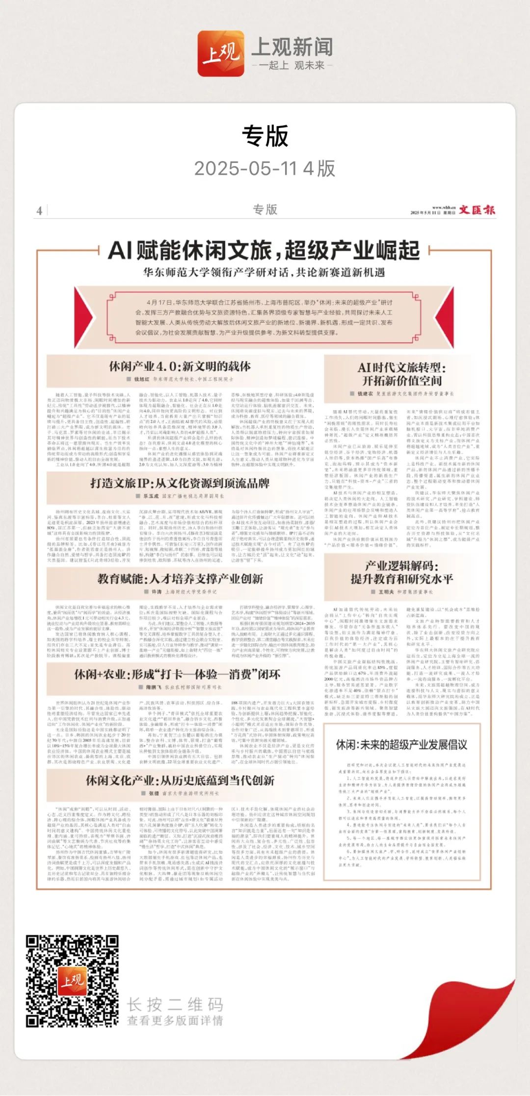5月11日,文汇报整版报道《AI赋能休闲文旅,超级产业崛起》