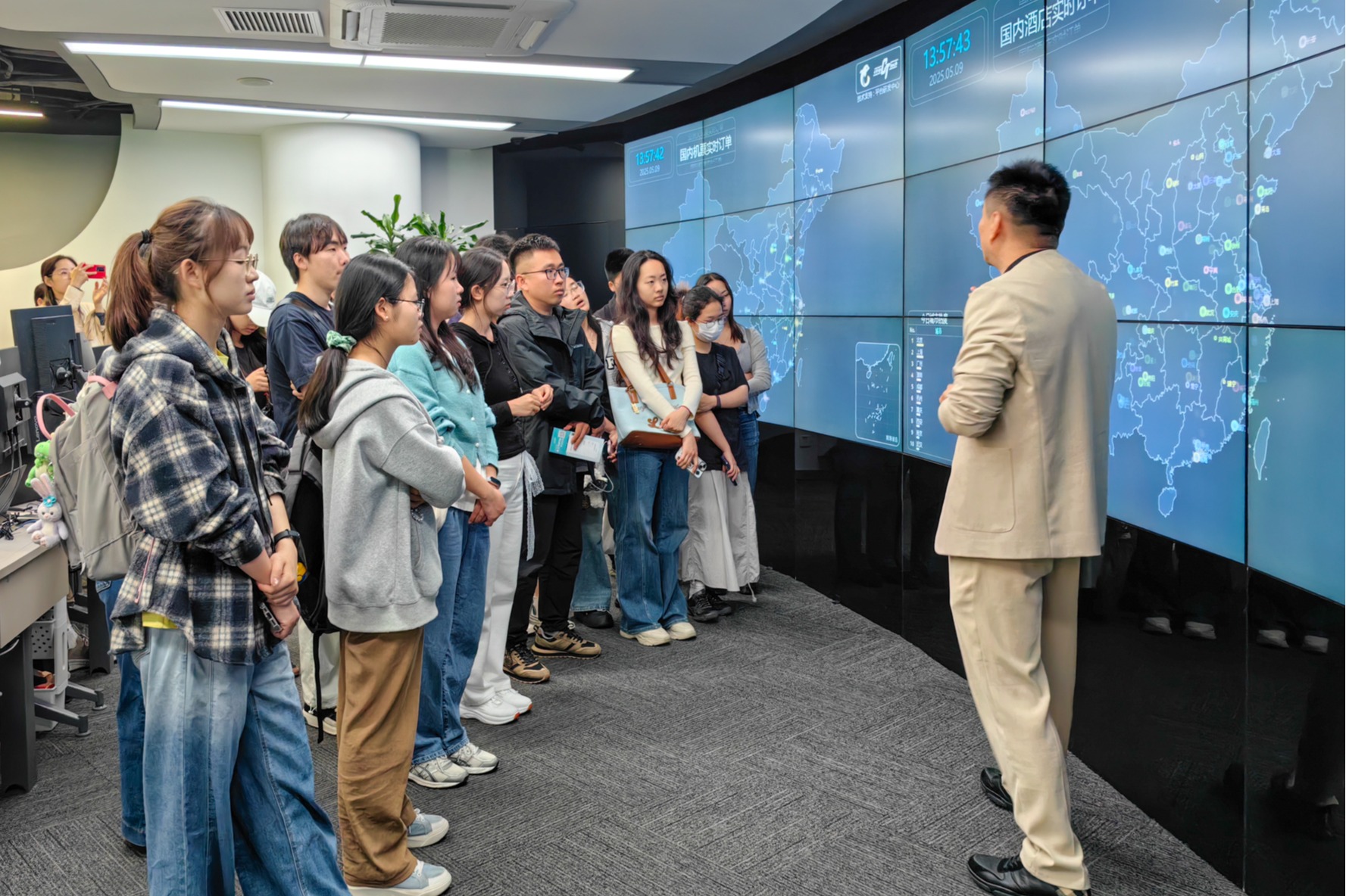 随后,师生一行深入探访了携程NOC实验室。透过实时滚动的数据大屏,国内外旅游订单的动态变化尽收眼底,大家不但惊叹于携程依托数据科学实现的海量资源精准调度能力,更是对其“智能+人文”双轮驱动的服务模式产生了全新认知。在高度智能化的算法系统之外,携程还配置了业内数量最为庞大的线下人工客服团队——从出行天气提醒、证件遗失协助等细节关怀,到人身安全预警、突发灾害应急等重大保障,“携程在手,说走就走”的承诺背后,是以技术赋能效率、以温情守护体验的完整闭环。
