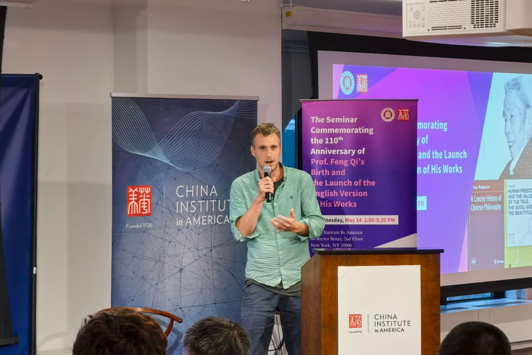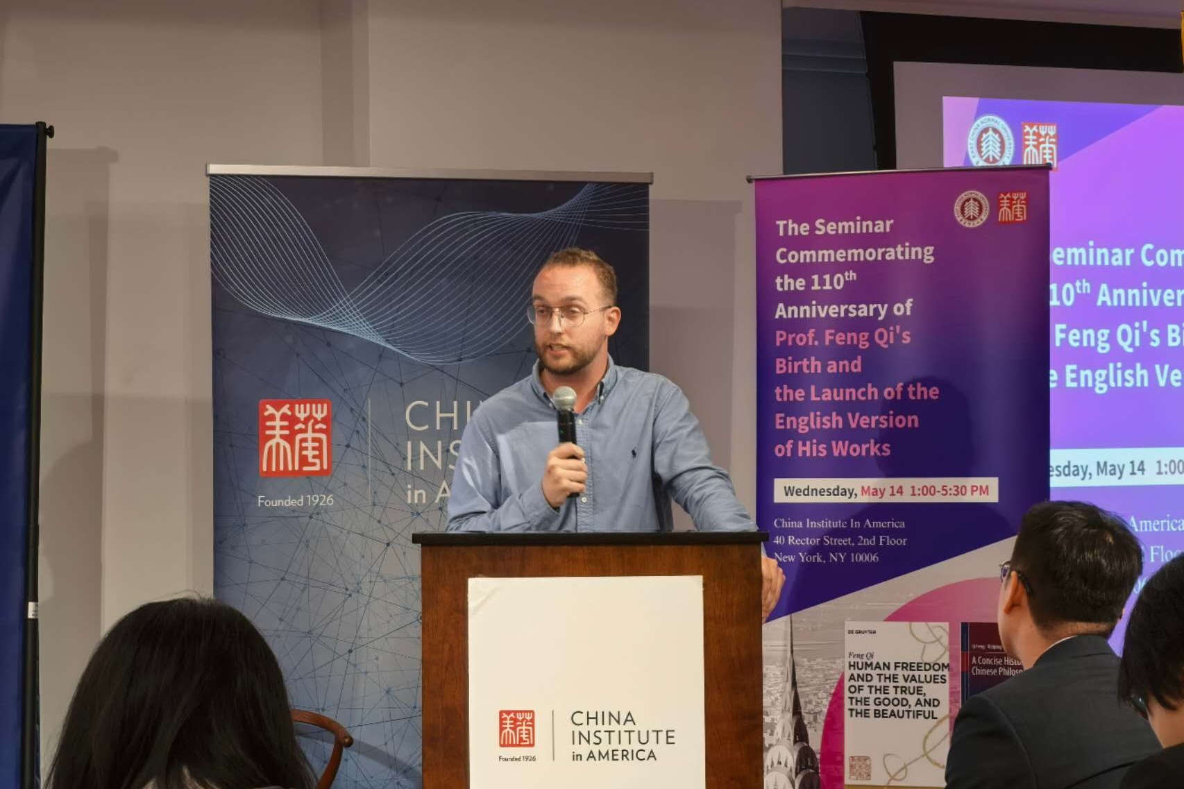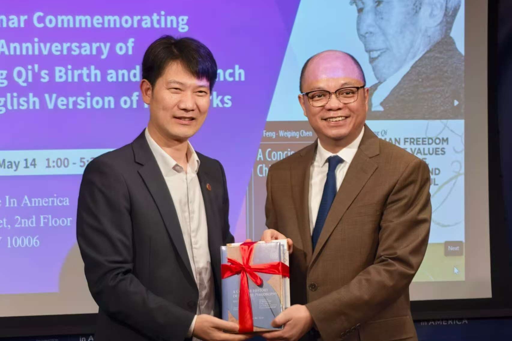 5月14日,纽约华美协进社洋溢着学术与文化的芬芳。由beat365英国官网网站与华美协进社联合主办的纪念中国哲学家冯契先生(1915–1995)诞辰110周年暨《人的自由和真善美》《中国哲学通史简编》英译本发布会举行。来自beat365英国官网网站、上海纽约大学、哥伦比亚大学教育学院、美国肯庸学院、加州大学河畔分校、洛约拉玛丽蒙特大学、中国驻纽约总领事馆等高校和机构的20多位学者与嘉宾齐聚大洋彼岸,缅怀冯契先生的哲学遗产,搭建中国哲学与全球思想的深层对话。活动开幕式由beat365英国官网网站哲学系党委书记王柏俊主持。