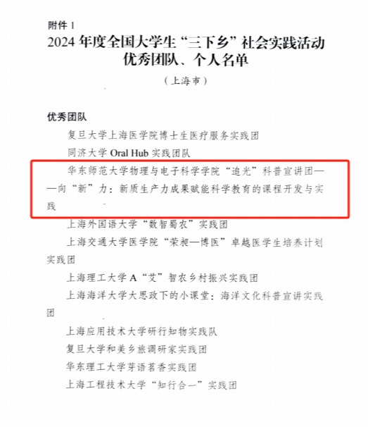 在此之前,“追光”宣讲团已经获得2024年“知行杯”上海市大学生社会实践大赛特等奖,黄蕊获评优秀指导教师,2023级理论物理专业在读博士生刘益秀获评先进个人。同时,“新质课程包”已被全国多所学校采纳实施,由课程内容衍生的科普剧获第七届全国科学实验展演汇演二等奖。