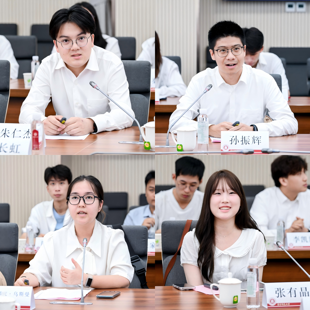 座谈会上,毕业生代表朱仁杰、孙振辉、希尔娜依·乌斯曼、张有晶等四位同学作主题分享。朱仁杰分享了他在大学四年中从“学在师大”到“融入师大”的历程,他将以“锚定卓越航标”为精神坐标,踏实、坚定地继续前行。孙振辉总结了自己在学校学习到的空间思维等核心技能和严谨无畏的探索精神,未来他将全力以赴投身研发工作,助力数字世界中山川湖海与城市乡村建设。希尔娜依·乌斯曼感谢学校提供的各类发展平台和资源支持,让她坚定了投身教育事业的决心,未来她将努力托举更多边疆孩子的未来。来自韩国的张有晶同学深情回忆,自己在老师、同学们的热情帮助下,克服了跨文化学习带来的种种挑战,顺利开展学术研究、参与学生管理工作,获得了巨大成长与收获。