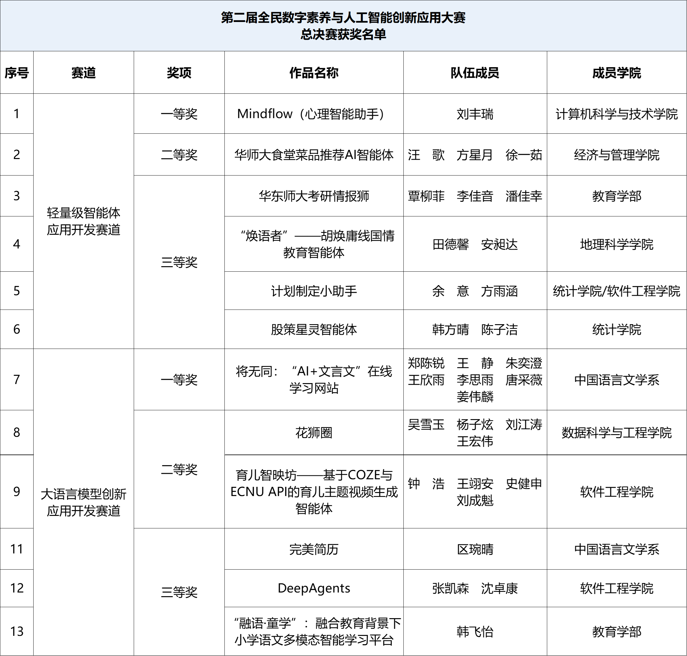 6月13日,第二届全民数字素养与人工智能创新应用大赛总决赛及颁奖典礼在普陀校区落下帷幕,24个学院的200多名同学踊跃参与,12支兼具创新性与实践性的队伍脱颖而出,他们以ChatECNU大模型为基座,交出了一份份关注校园生活体验、大胆跨越学科壁垒的创新答卷。