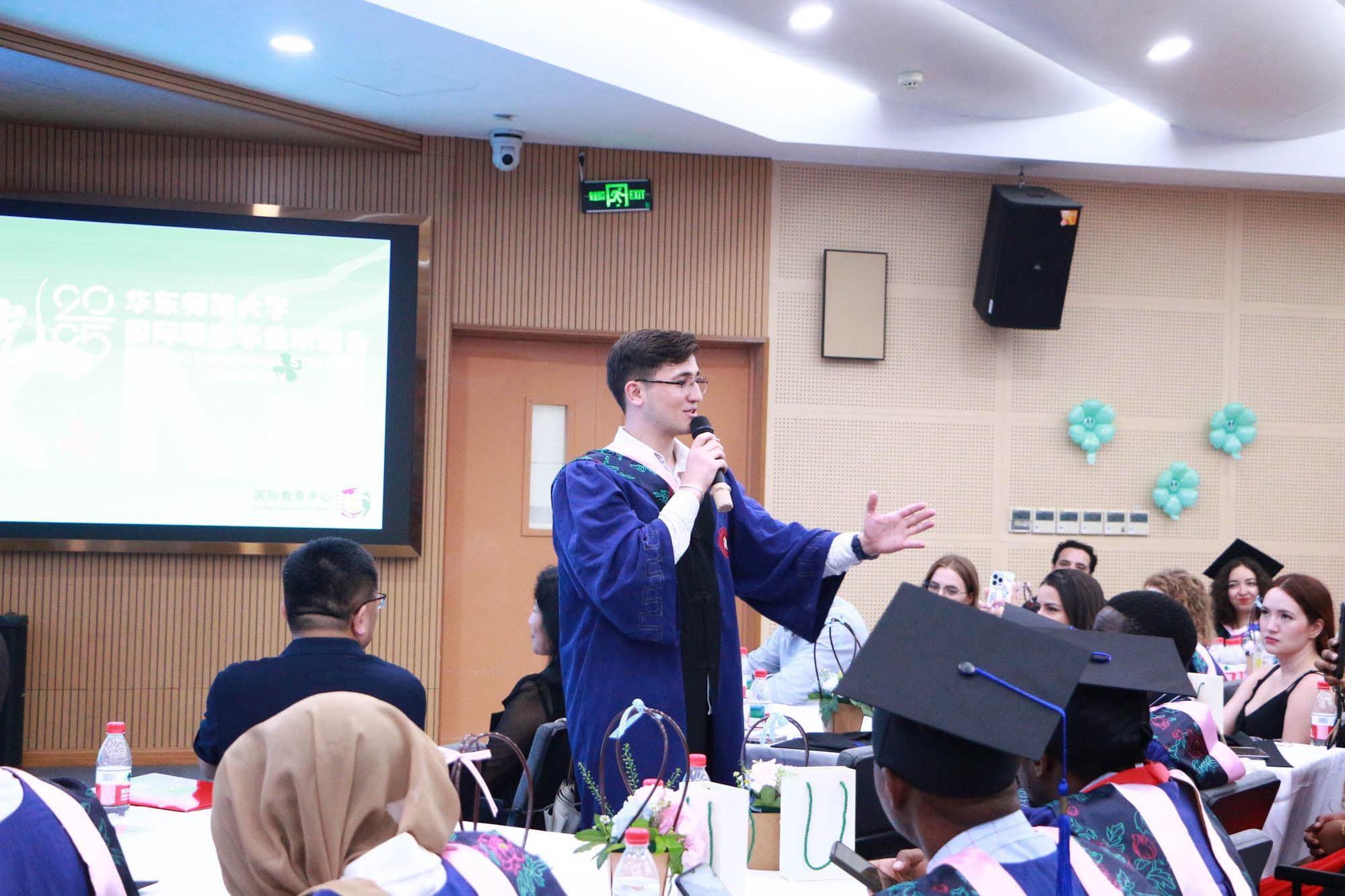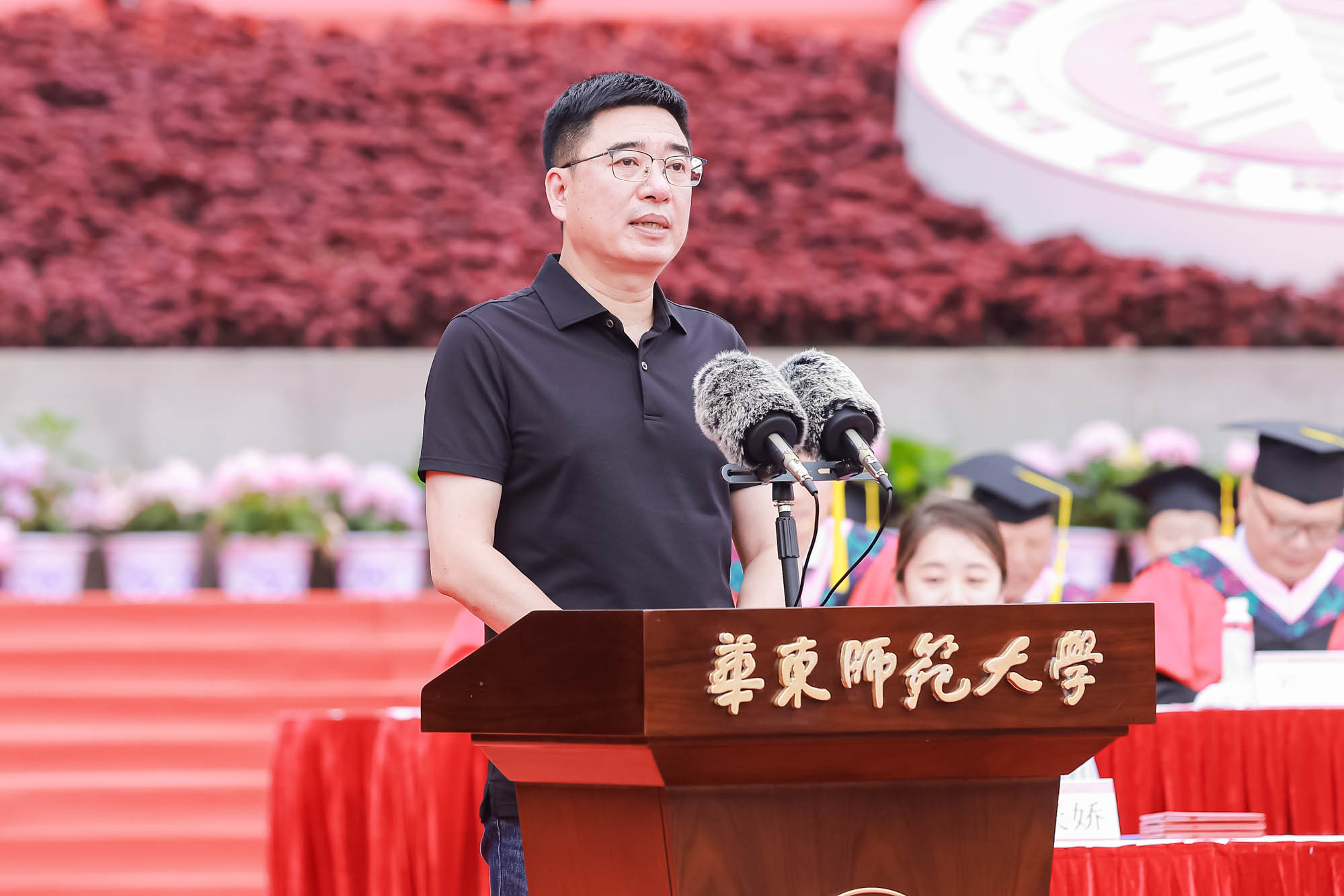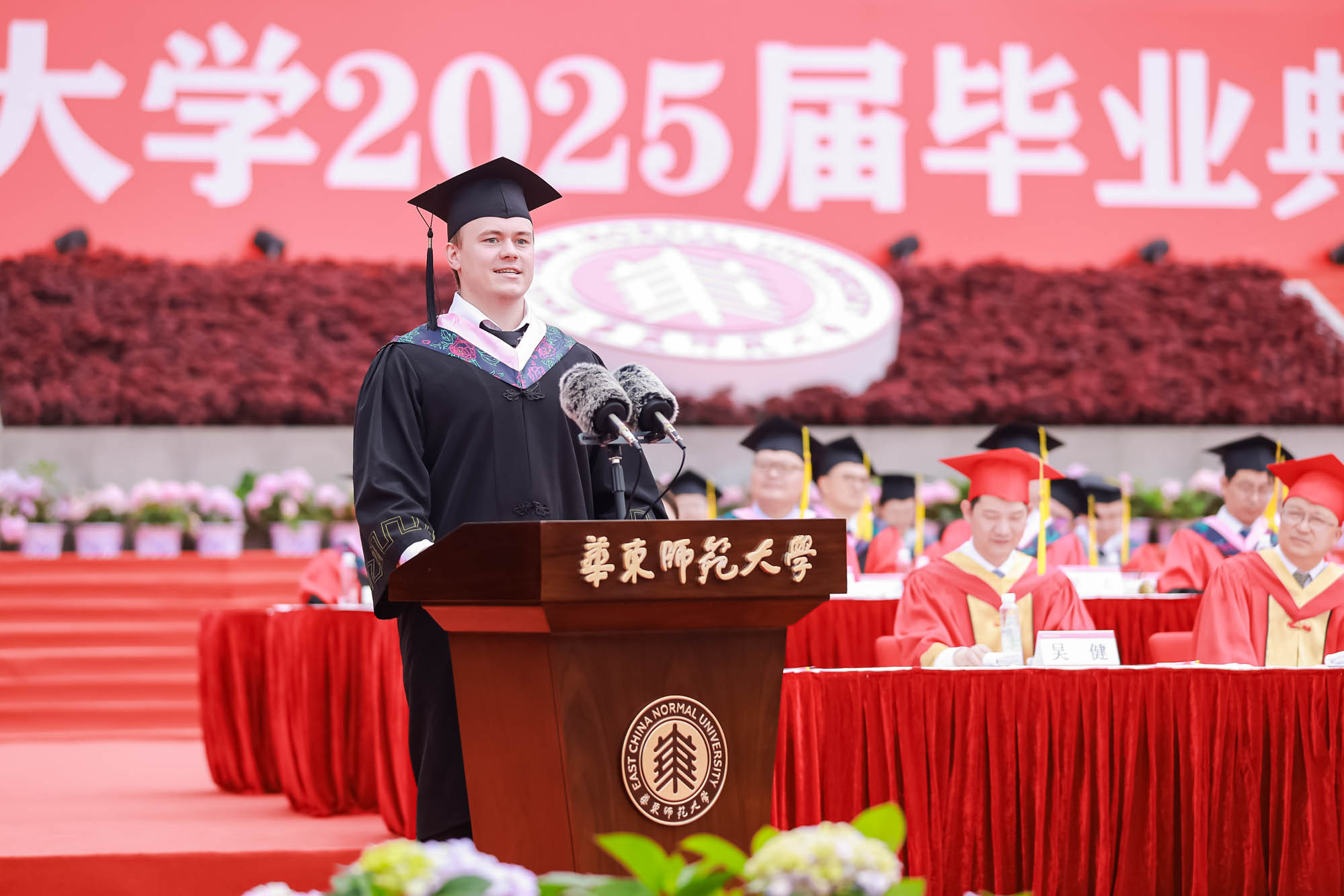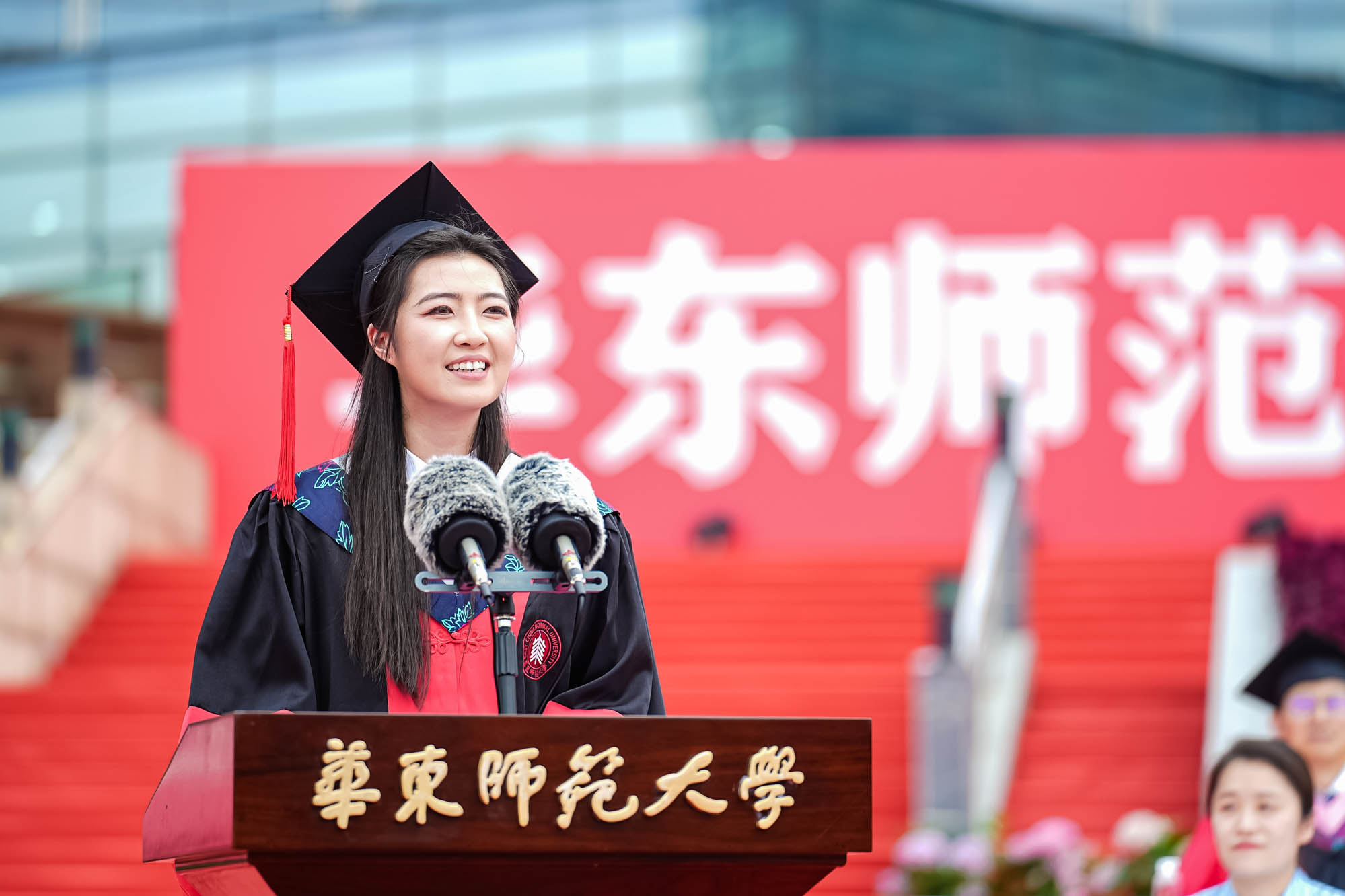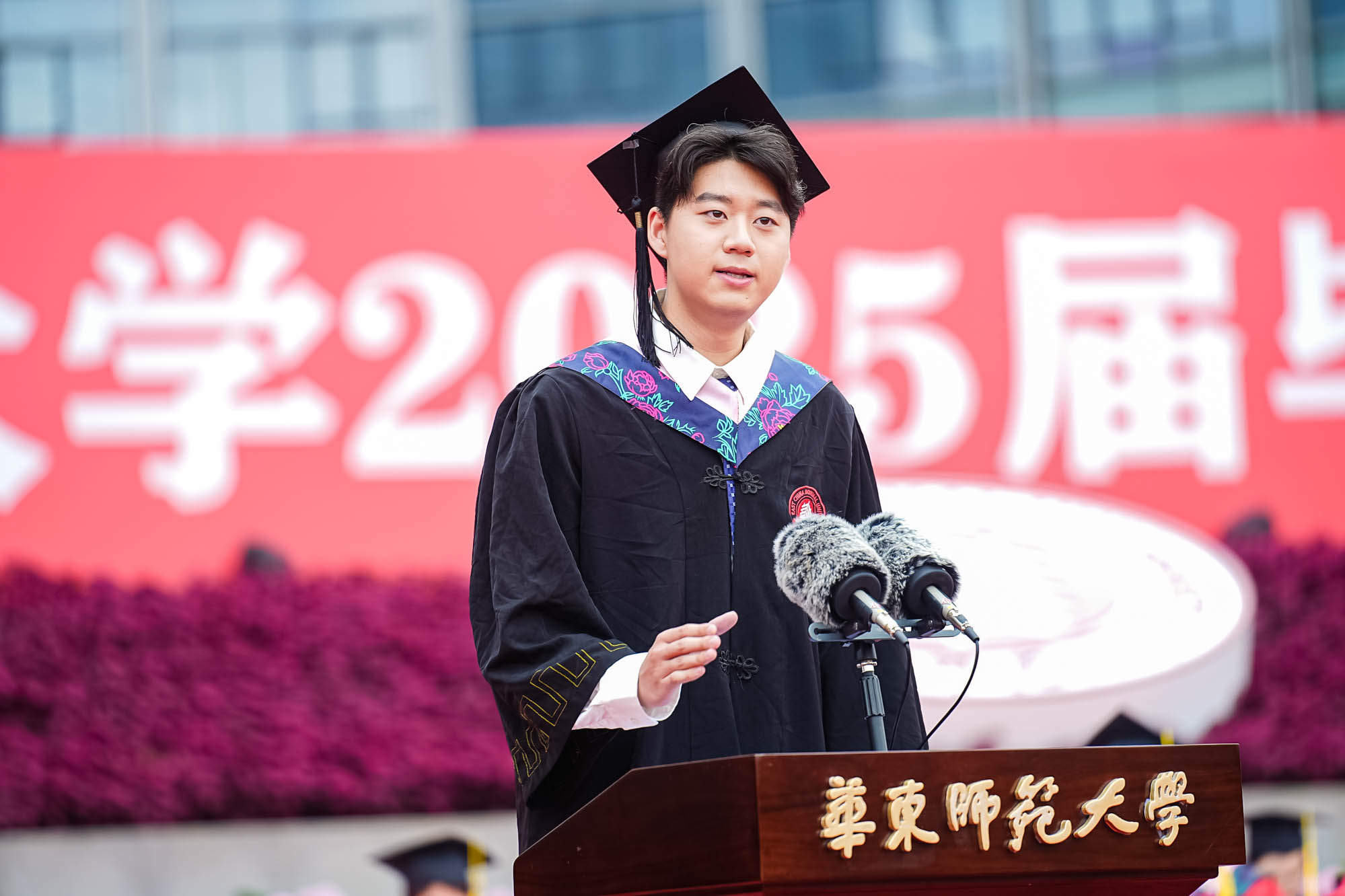 研究生代表,上海市优秀毕业生、物理与电子科学学院2022级物理电子学硕博连读生隋峰锐在毕业典礼上分享科研经历与成长感悟。