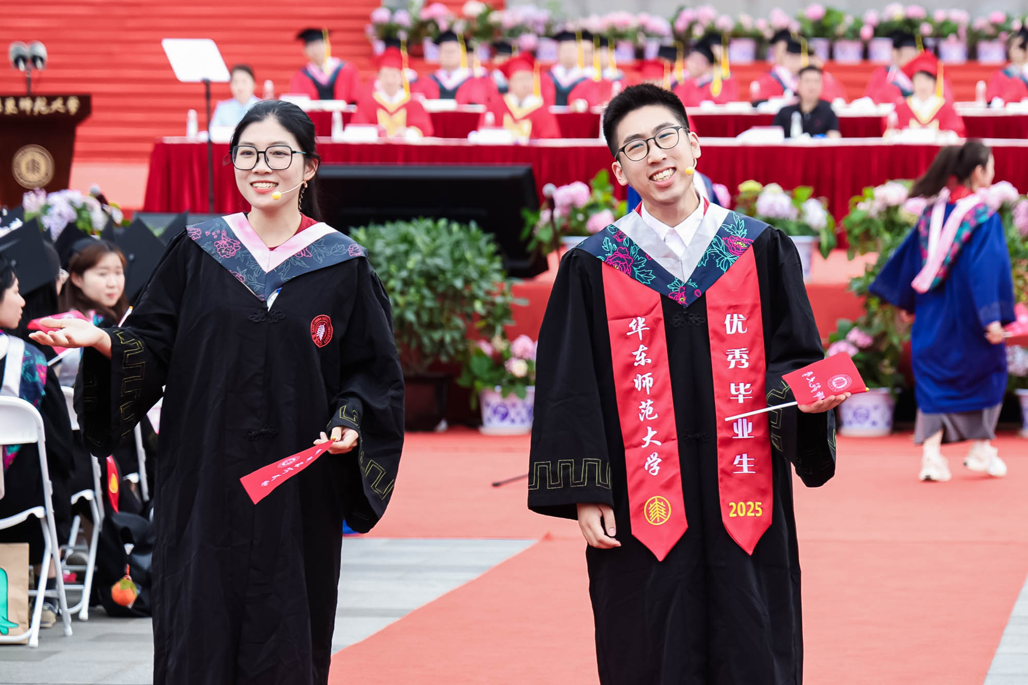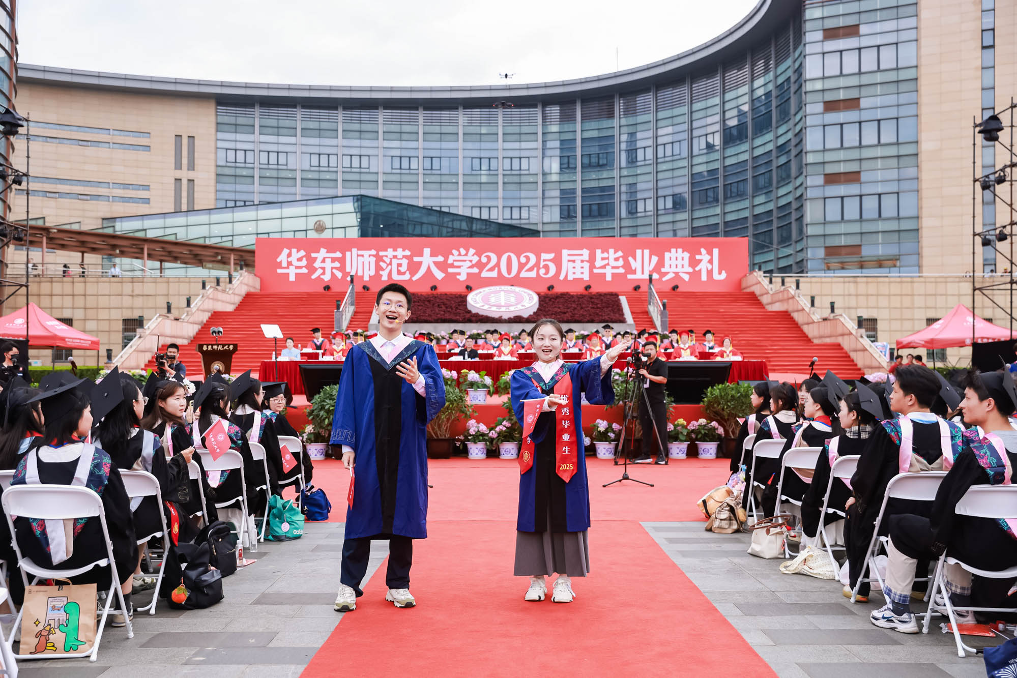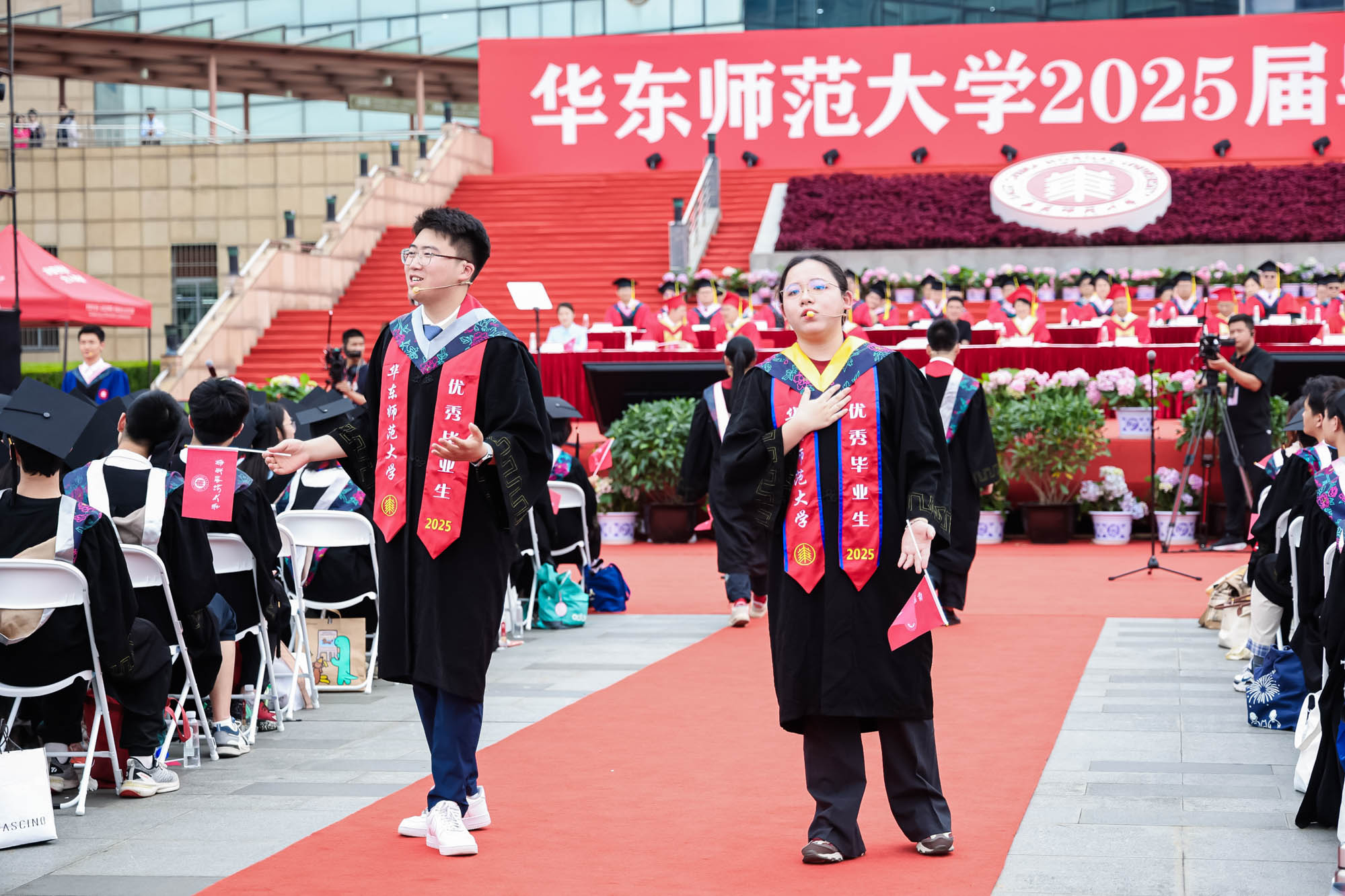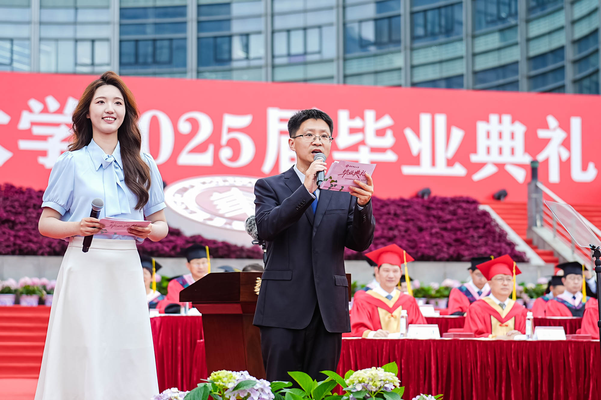 毕业典礼由统计学院教授於州和传播学院2025届本科生陈瑜潇主持
