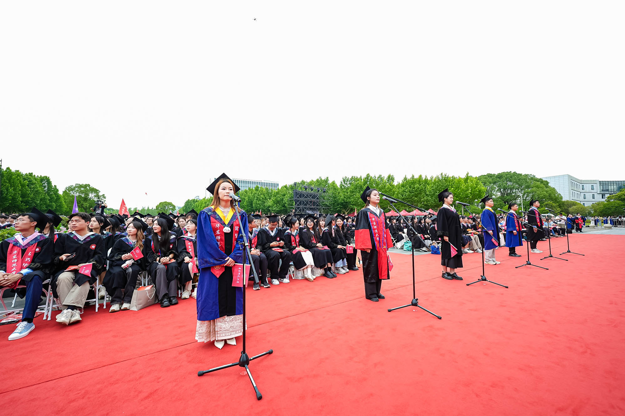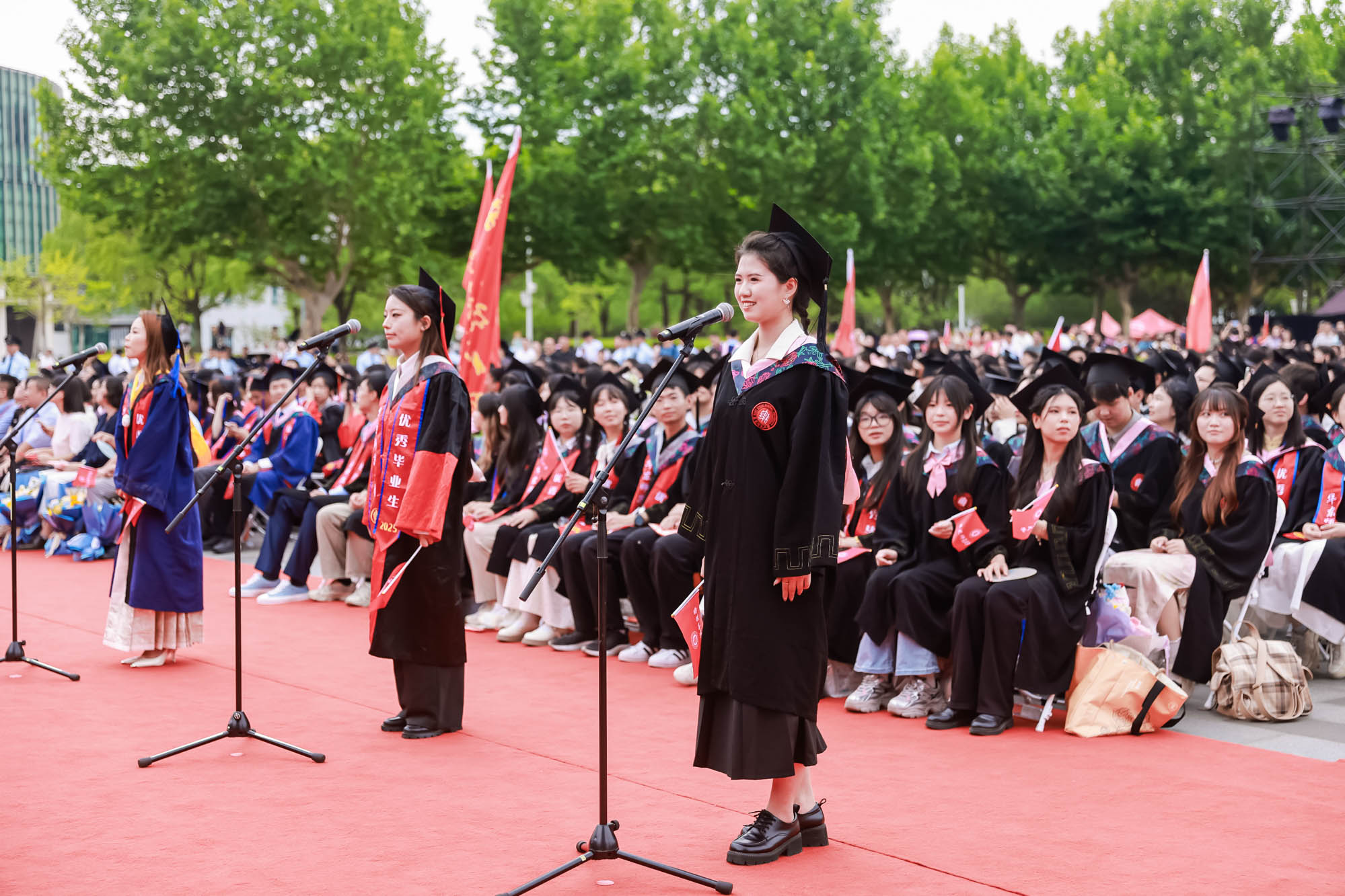 毕业生出征仪式上,将奔赴乡村教育振兴一线的本科生吕宸莹、去上海交大附中任教的硕士生黄温瑞、投身于科研的博士生薛念念、赴陕西基层服务社会的硕士生魏建国、投身国产芯片研发的硕士生周捷宇、将赴清华大学继续深造的本科生赵龙强以铿锵有力的朗诵展示了beat365英国官网网站毕业生踔厉奋发、砥砺前行的风采。