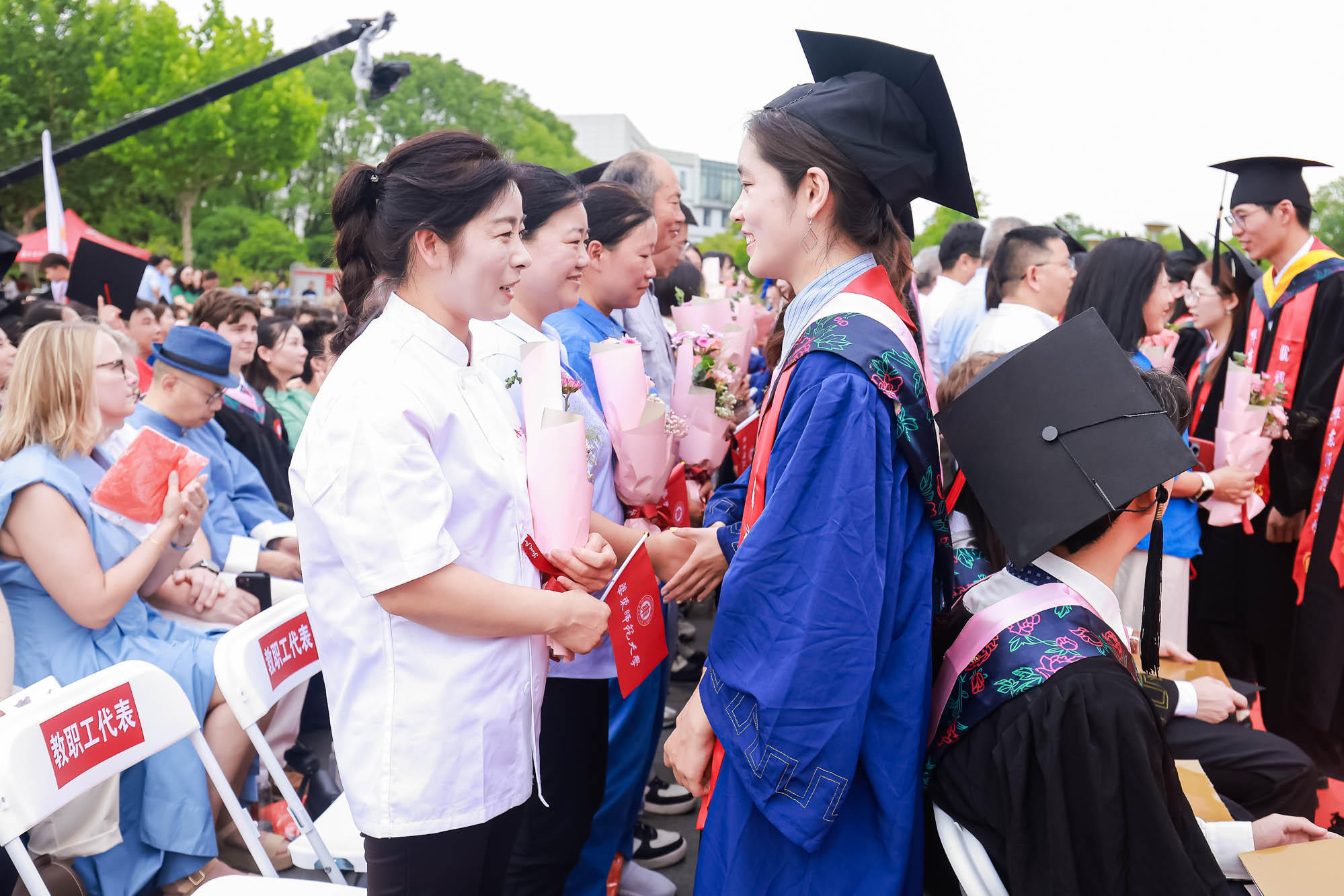 仪式现场,“学生身边最可爱的人”为毕业生送上寄语,他们是校园保安、食堂师傅、宿管阿姨、校医院医生、图书馆工作人员、辅导员、教务员、维修及校园环境员工们等。他们用日复一日的平凡坚守,编织起毕业生们最温暖的校园记忆。毕业生代表手捧鲜花,献给在学校各个岗位上默默耕耘的老师们,并致以最深的敬意与感激。