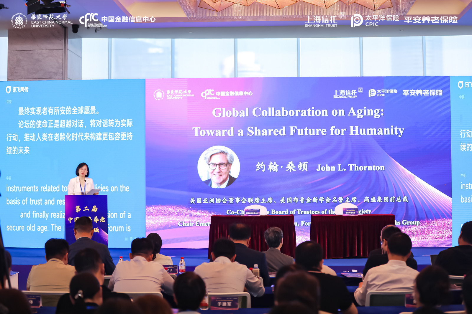 孟溦教授宣读美国亚洲协会董事会联席主席、布鲁金斯学会名誉主席、高盛集团前总裁约翰·桑顿贺信