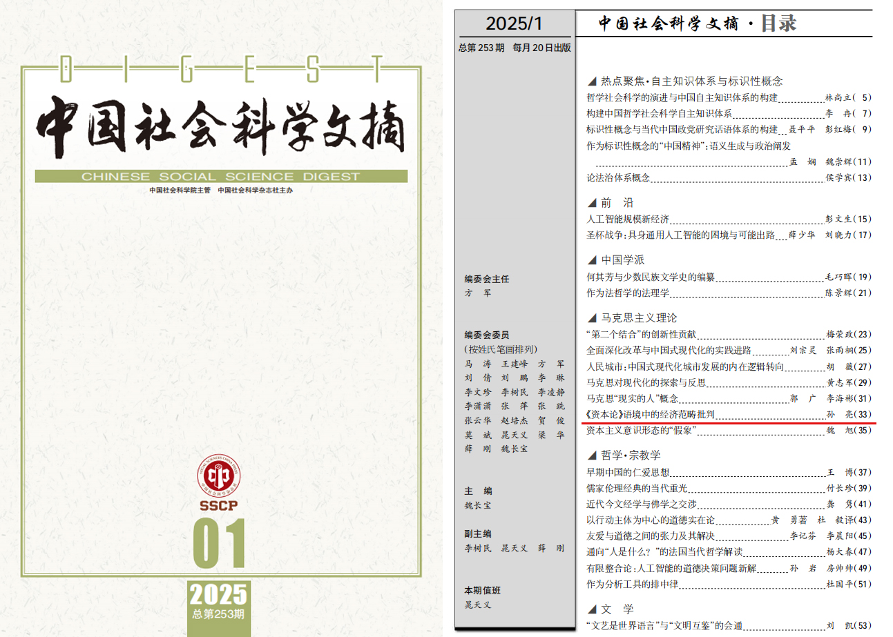 |孙亮教授文章被《中国社会科学文摘》全文转载,探讨《资本论》语境中的经济范畴批判