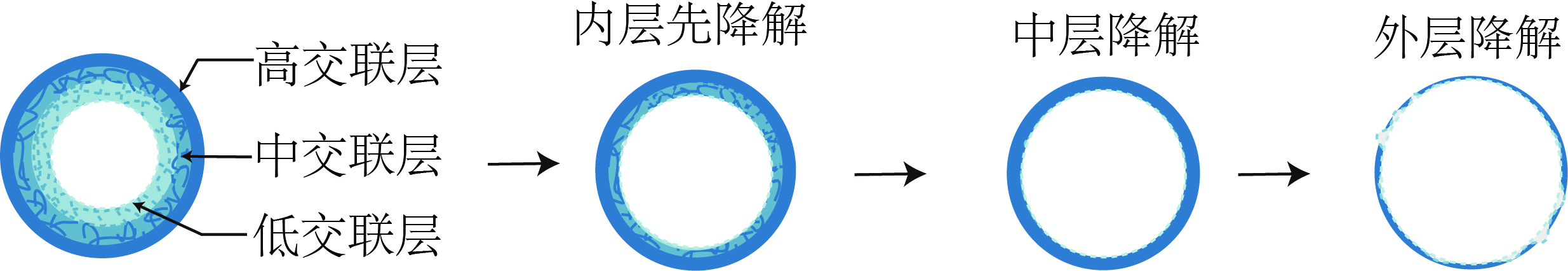 项目从分子交联梯度与降解反应的内在关系为研究出发点,发展一种逐级交联反应策略。通过构建水凝胶管壁的梯度交联结构,实现水凝胶导管支架在体内环境下的逐级降解,即如上图所示,从导管内壁开始,低交联度的内层先行降解,并逐步向外围高交联层扩展。通过精确调控水凝胶管壁的梯度交联程度,能够有效控制支架在体内环境中的降解速率,进而实现降解速率,力学支撑性能与组织愈合速率的同步匹配。