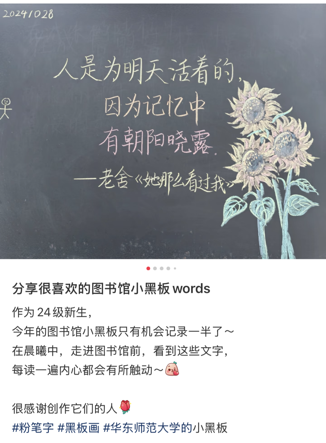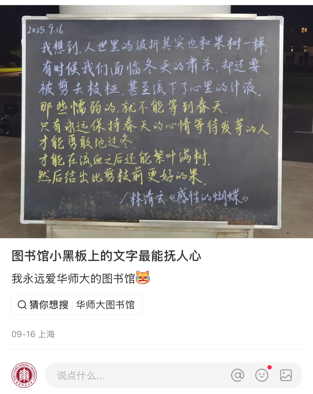 “小黑板绝非随意书写,它更像是精准的情感共振器。”图书馆该项目的负责老师江颖盈表示。每一句诗、每一段文,都敏锐捕捉着学生群体的集体情绪脉动——新生的憧憬、期末的压力、节日的思念、季节流转中的感怀。它像一位沉默而体贴的老友,总在最需要的时刻,给予恰如其分的回应、鼓励或抚慰,治愈疲惫、焦虑与迷茫。