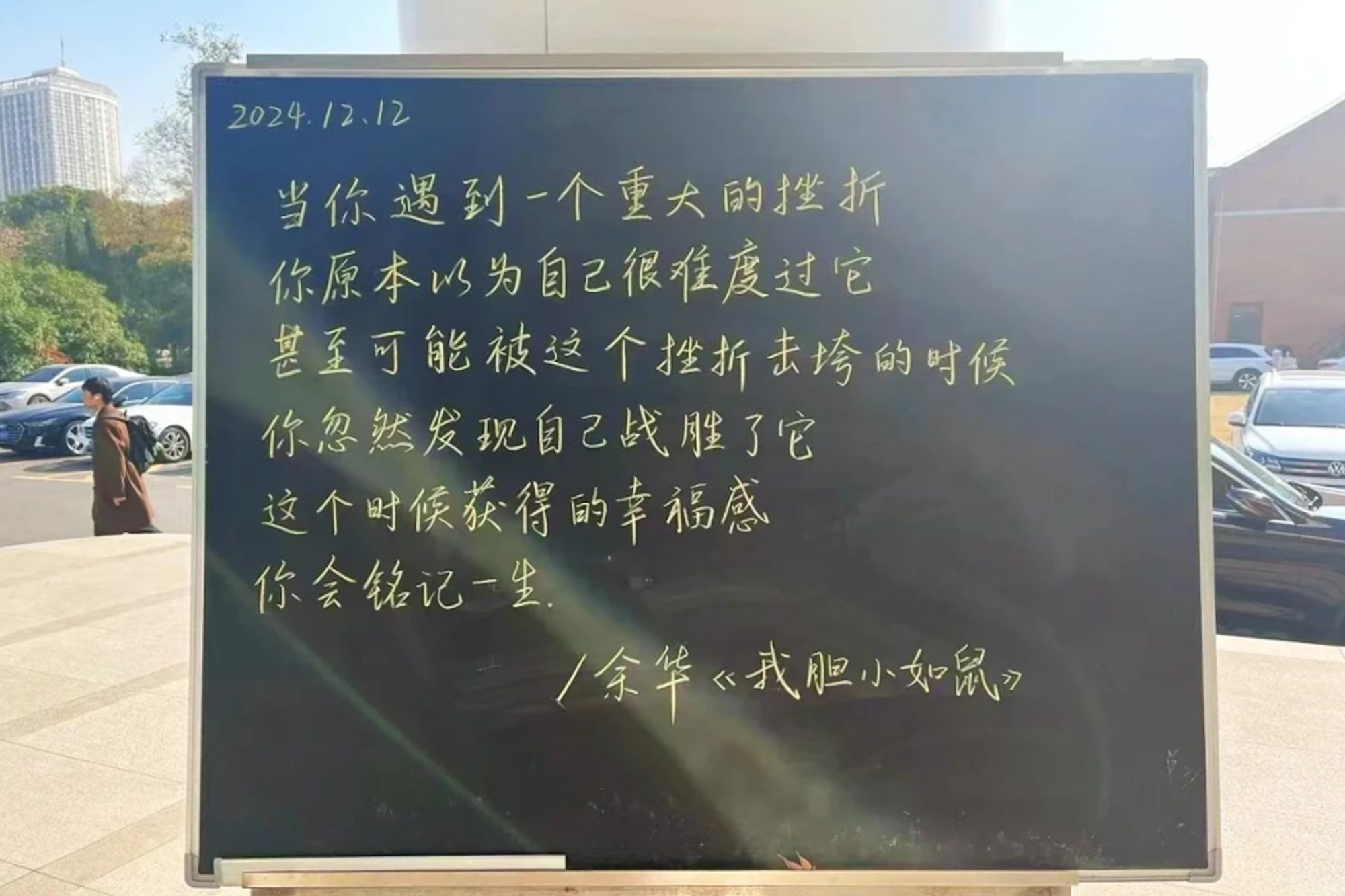 文字虽无声,却充满力量。不论是在开学期末、季节更替或传统佳节等时间节点,还是在情绪的低谷时,师生都可以在小黑板上得到心灵的慰藉,这让小黑板被学生们亲切地称为“心灵盲盒”。