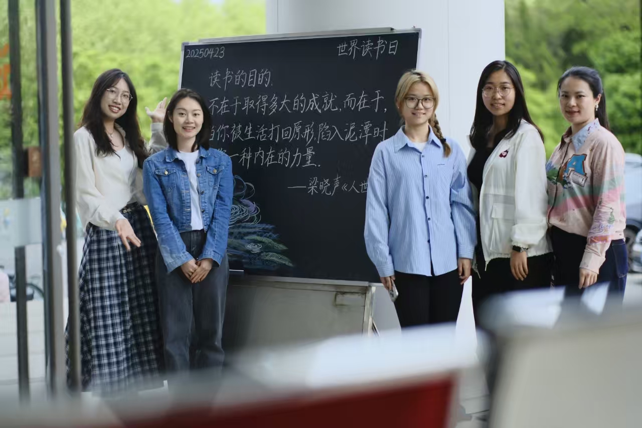 图书馆江颖盈老师(右一)和小黑板板书团队们