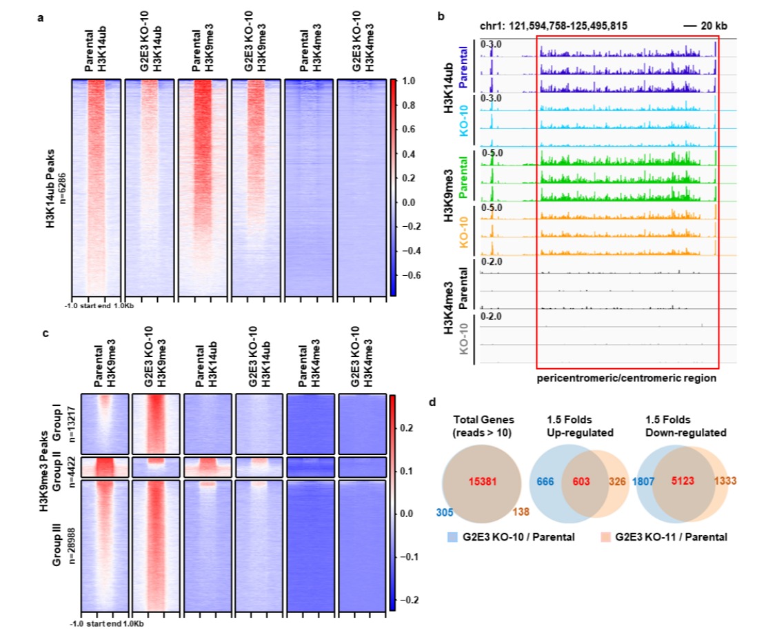 令人惊喜的是,该调控机制的影响远不止于异染色质区域。研究发现,G2E3的缺失不仅损害了近着丝粒异染色质的结构,还导致SUV39H1/2和H3K9me3在常染色质区域的异常积累,引发广泛的转录抑制。