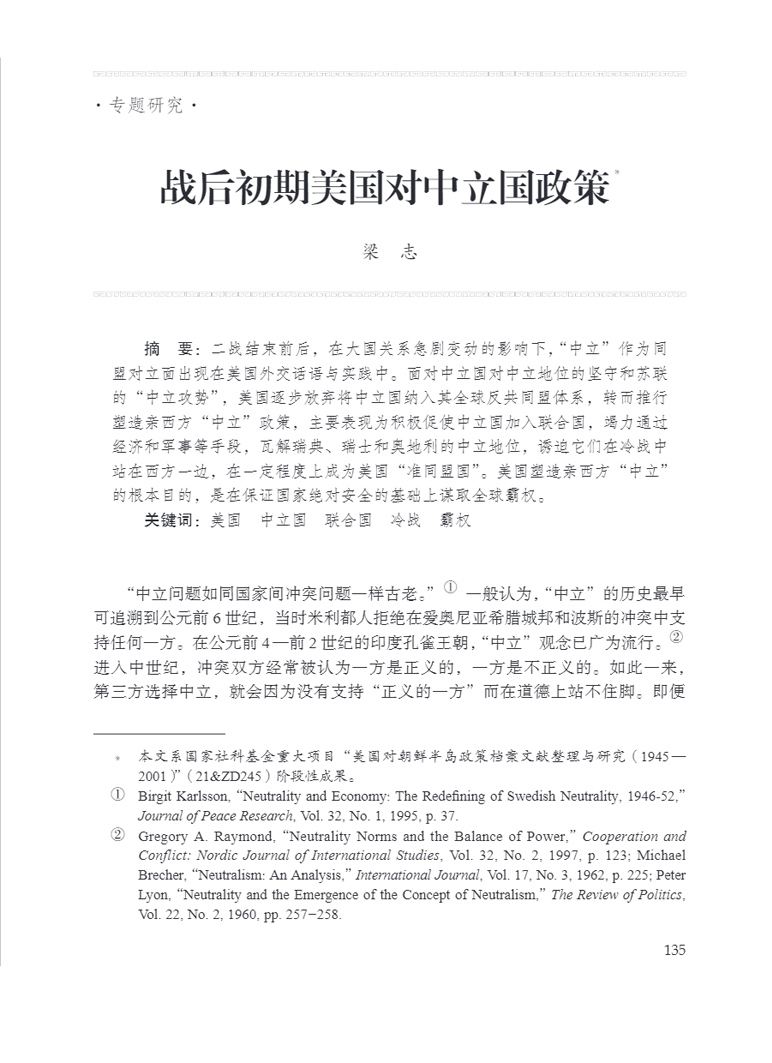 简 介:二战结束前后,在大国关系急剧变动的影响下,“中立”作为同盟对立面出现在美国外交话语与实践中。面对中立国对中立地位的坚守和苏联的“中立攻势”,美国逐步放弃将中立国纳入其全球反共同盟体系,转而推行塑造亲西方“中立”政策,主要表现为积极促使中立国加入联合国,竭力通过经济和军事等手段,瓦解瑞典、瑞士和奥地利的中立地位,诱迫它们在冷战中站在西方一边,在一定程度上成为美国“准同盟国”。美国塑造亲西方“中立”的根本目的,是在保证国家绝对安全的基础上谋取全球霸权。