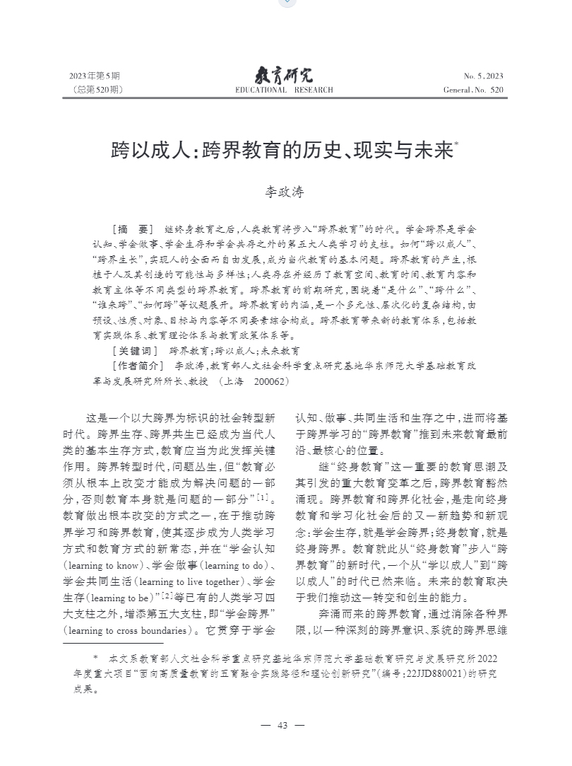 简 介:《跨以成人:跨界教育的历史、现实与未来》一文作者系beat365英国官网网站基教所所长李政涛教授,刊于《教育研究》杂志2023年第5期。本文提出,继终身教育之后,人类教育将步入“跨界教育”的时代。学会跨界是学会认知、学会做事、学会生存和学会共存之外的第五大人类学习的支柱。如何“跨以成人”“跨界生长”,实现人的全面而自由发展,成为当代教育的基本问题。跨界教育的产生,根植于人及其创造的可能性与多样性;人类存在并经历了教育空间、教育时间、教育内容和教育主体等不同类型的跨界教育。跨界教育的前期研究,围绕着“是什么”“跨什么”“谁来跨”“如何跨”等议题展开。跨界教育的内涵,是一个多元性、层次化的复杂结构,由预设、性质、对象、目标与内容等不同要素综合构成。跨界教育带来新的教育体系,包括教育实践体系、教育理论体系与教育政策体系等。