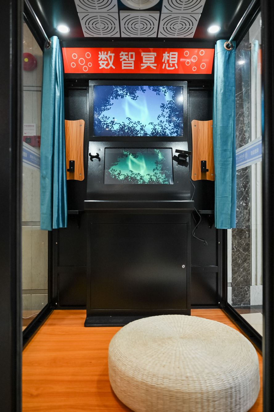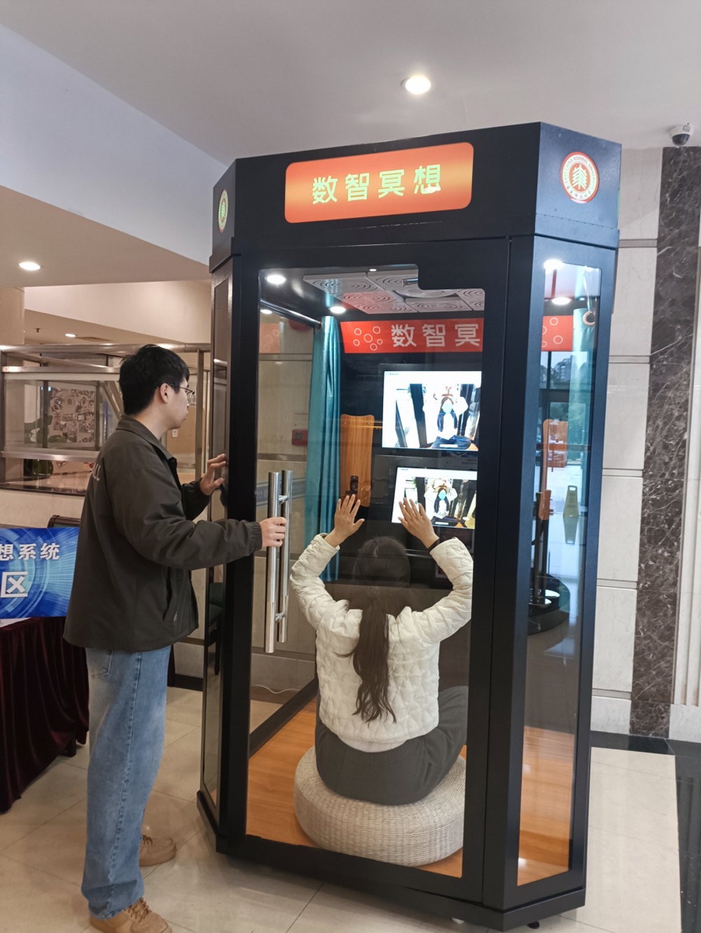 据介绍,系统采用“一套系统+三种产品形态”的布局:移动端APP用于伴随式训练,可识别冥想前状态、匹配节奏并生成个体化建议;AR冥想眼镜以沉浸式视觉与多模态信号联动,提升入静效率与专注体验;AI数智微厅以小型舱体承载采集、反馈与隐私空间,实现“即用即走”的沉浸训练,可部署于学校、社区、企业、医疗康养与公共服务场景,覆盖不同人群与需求。