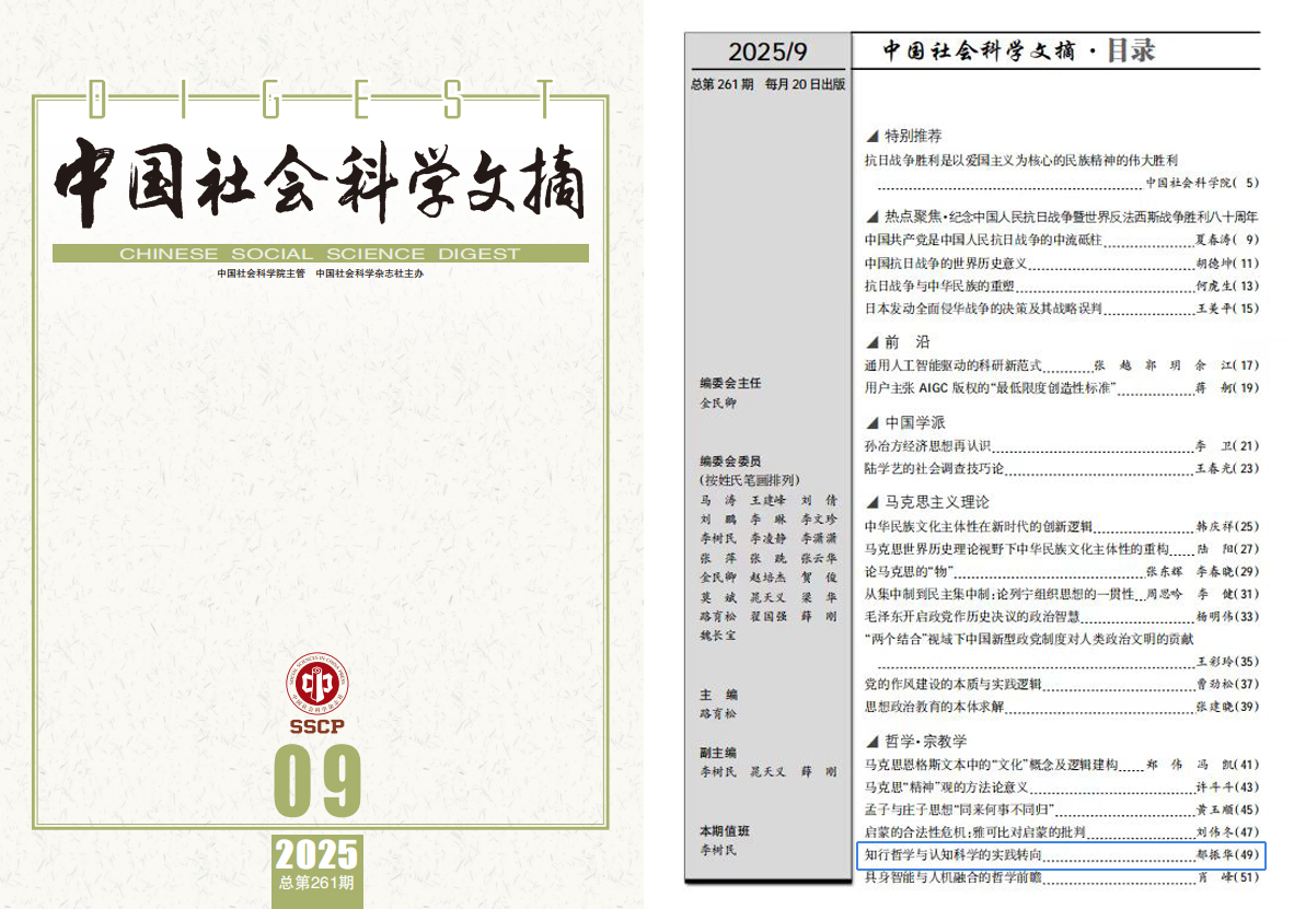 beat365英国官网网站中国现代思想文化研究所暨哲学系教授郁振华《知行哲学与认知科学的实践转向》一文被《中国社会科学文摘》2025年第9期转载。文章摘自2025年第4期《社会科学》。