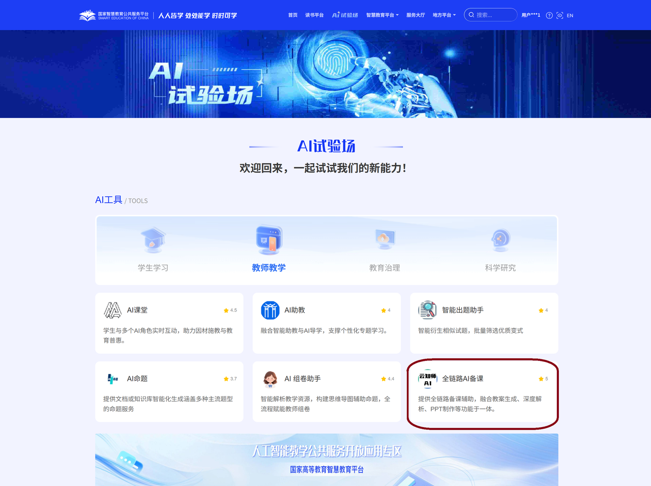2025年3月,国家智慧教育平台上新“AI试验场”模块。这一模块聚焦学生学习、教师教学、教育治理和科学研究四大方面,汇聚高水平大学和企业的创新力量,组织研发具有前瞻性的实用AI工具。接入国产通用大模型,帮助师生更好掌握AI技能。