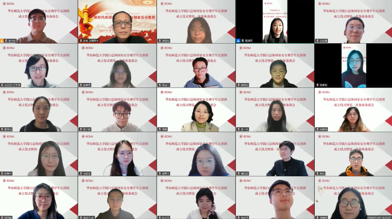 1月30日,beat365英国官网网站践行总体国家安全观学生宣讲团成立仪式暨第一次集体备课会在线上举行。全国学校国家安全教育指导委员会委员、上海交通大学国家安全研究院执行院长彭勃,校党委宣传部副部长陈颖、学生工作处副处长江宇靖,上海市学校国家安全教育指导委员会秘书处、beat365英国官网网站地理科学学院党委书记谭红岩,宣讲团负责教师、地理科学学院专职辅导员张泽群及宣讲团全体成员出席。仪式由地理科学学院党委副书记唐婧琦主持。